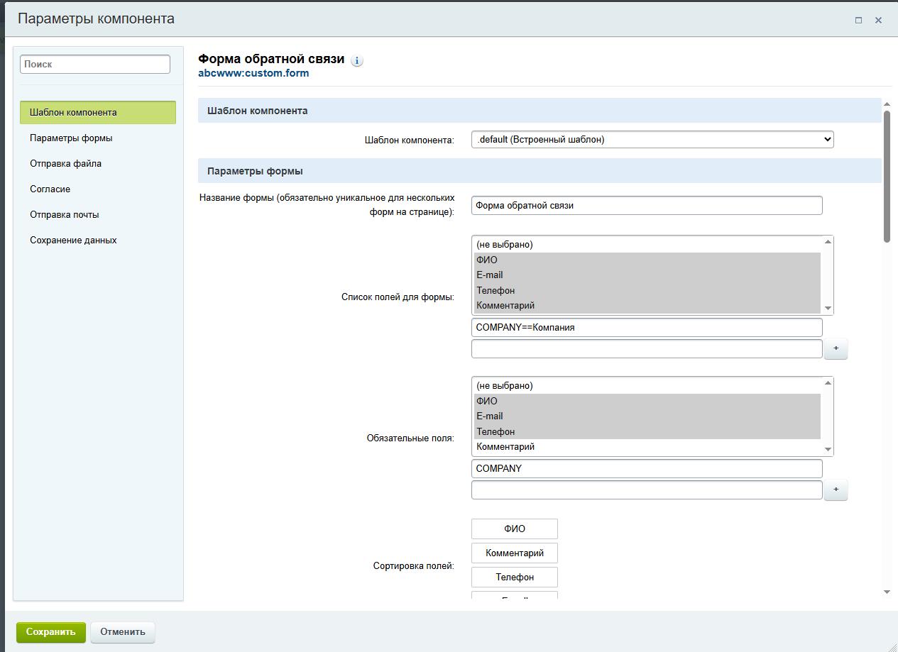 Настройки компонента позволяют выбрать предустановленные поля формы из предложенного списка, отсортировать их и задать обязательные. Для предустановленных полей зарезервированы имена полей: CF_NAME, CF_PHONE, CF_EMAIL, CF_COMMENT. Есть возможность добавить в форму дополнительные поля (атрибут name), название полей можно добавить тут же через разделитель == (пример: COMPANY==Компания) - префикс CF_ в настройках не нужно писать, он добавится в шаблоне автоматически.