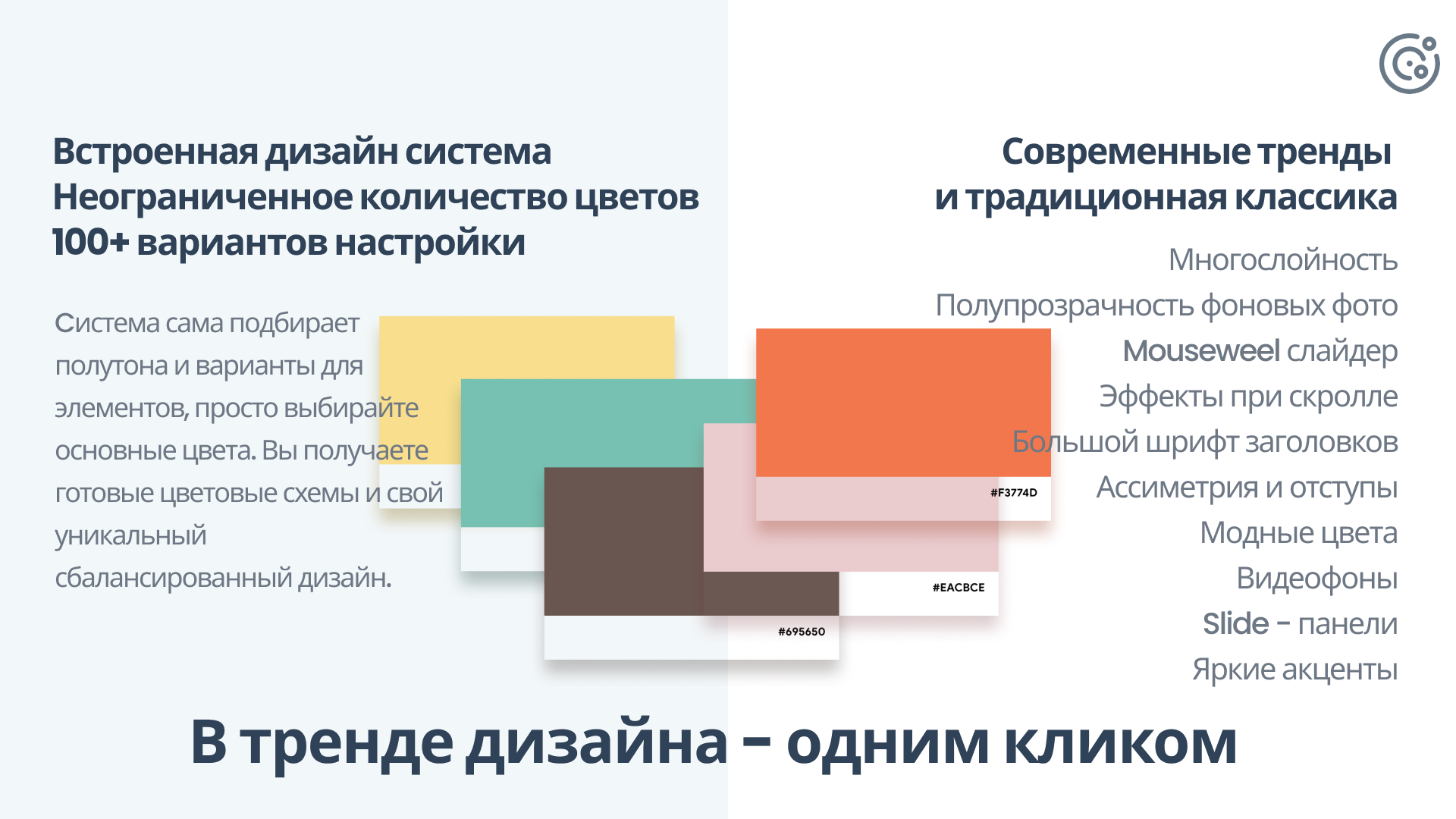 - Современные тренды и традиционная классика. Изменился тренд дизайна? Круглые углы сменили плоские, а плоский Flat опять победил 3D и тенюшки? Измените стиль сайта в несколько кликов, сохранив фирменный стиль.