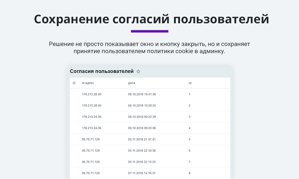 * NEW * Решение умеет интегрироваться с Соглашениями битрикса и сохранять согласия пользователей с политикой cookie в админку!