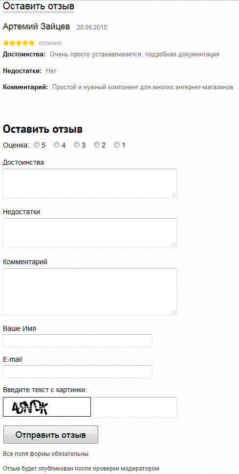 Оценка отзыва может добавляться к оценкам товара (типовой компонент голосование).