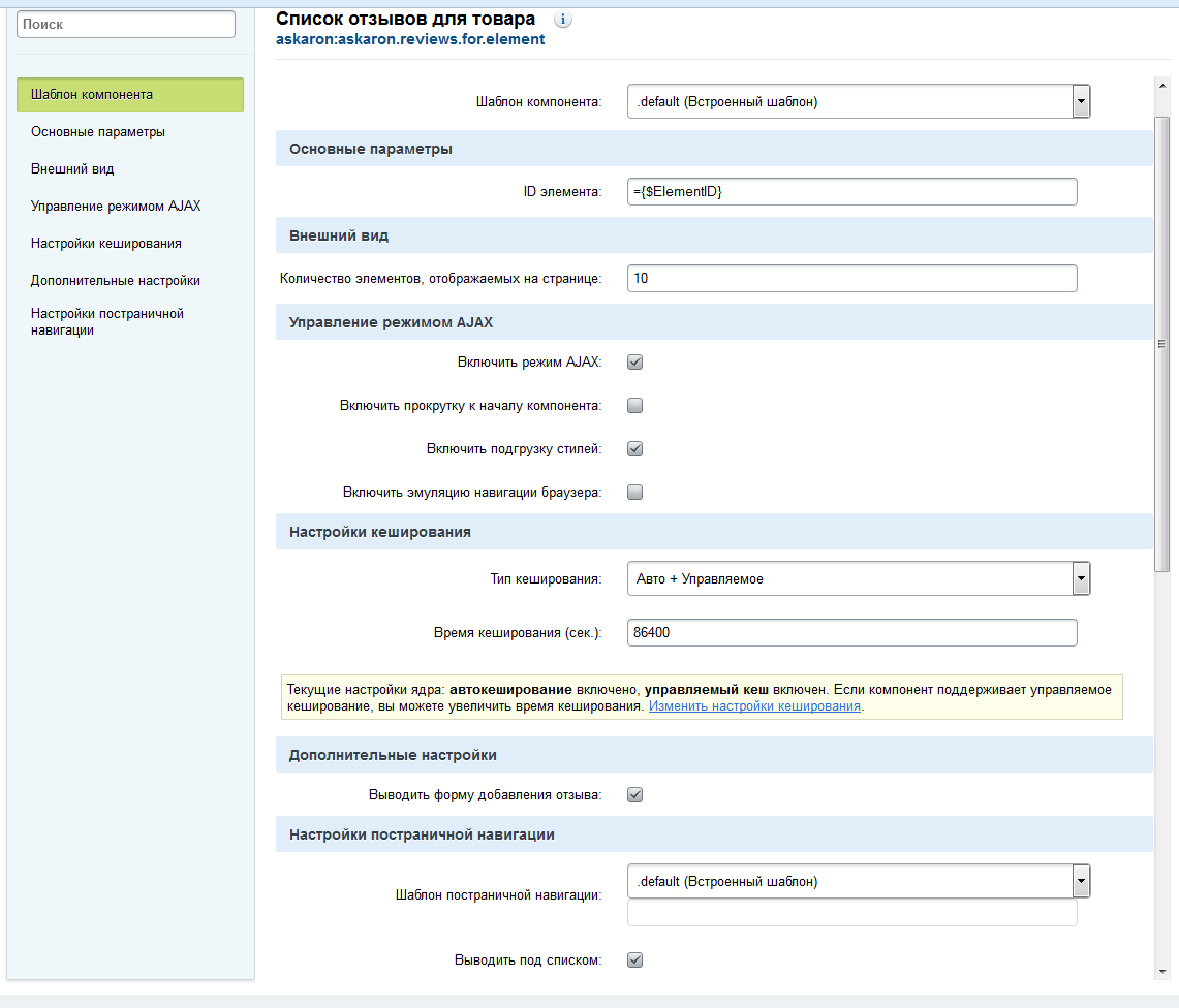 - Разместите компонент "список отзывов для элемента" на странице.