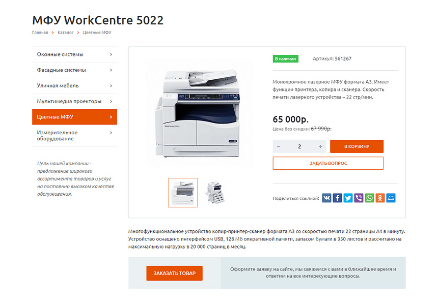 - Компактный блок заказа товара с ценой, индикатором наличия и формой обратной связи “Задать вопрос”;