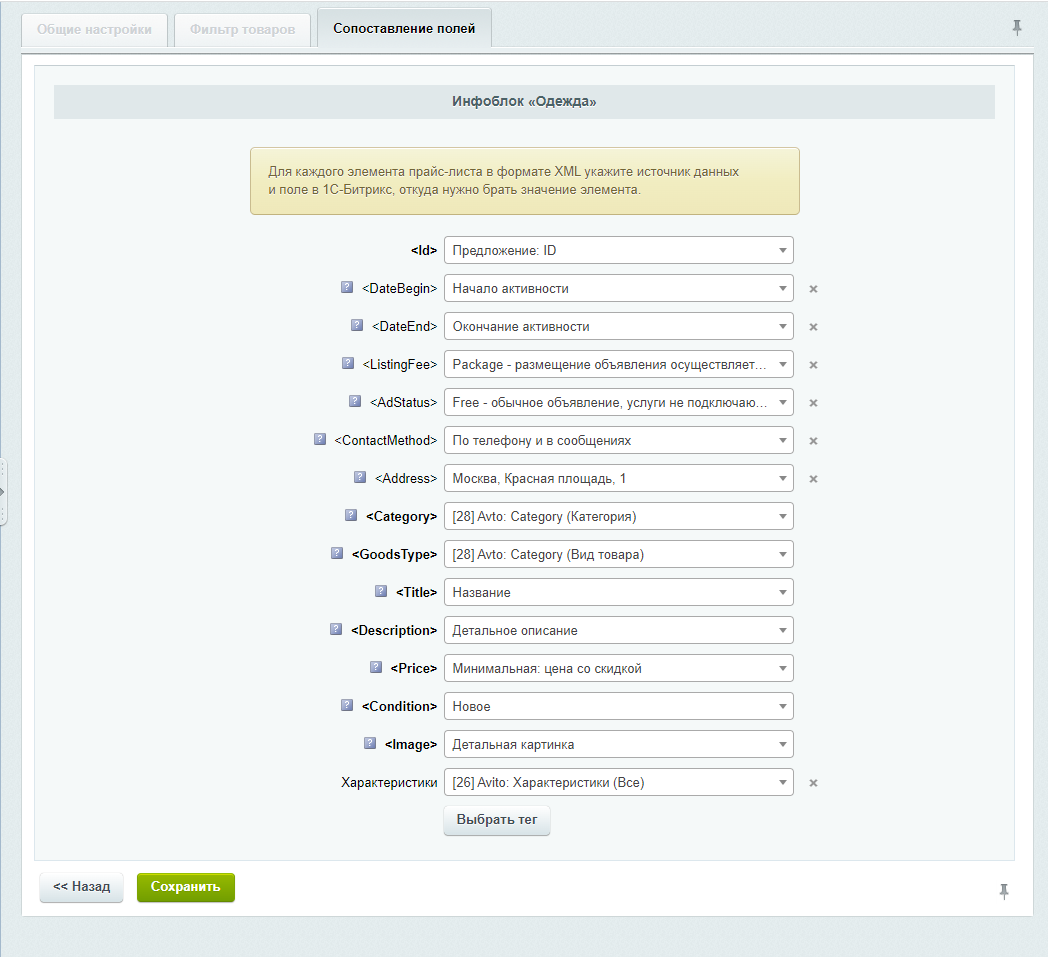 Значения тегов можно выгружать из свойств товаров - для этого в настройках файла объявлений ^1 на шаге Сопоставление полей добавьте тег Произвольный, введите название тега по документации Авито ^2 (например, "Color") и свойство, из которого нужно загружать значение.