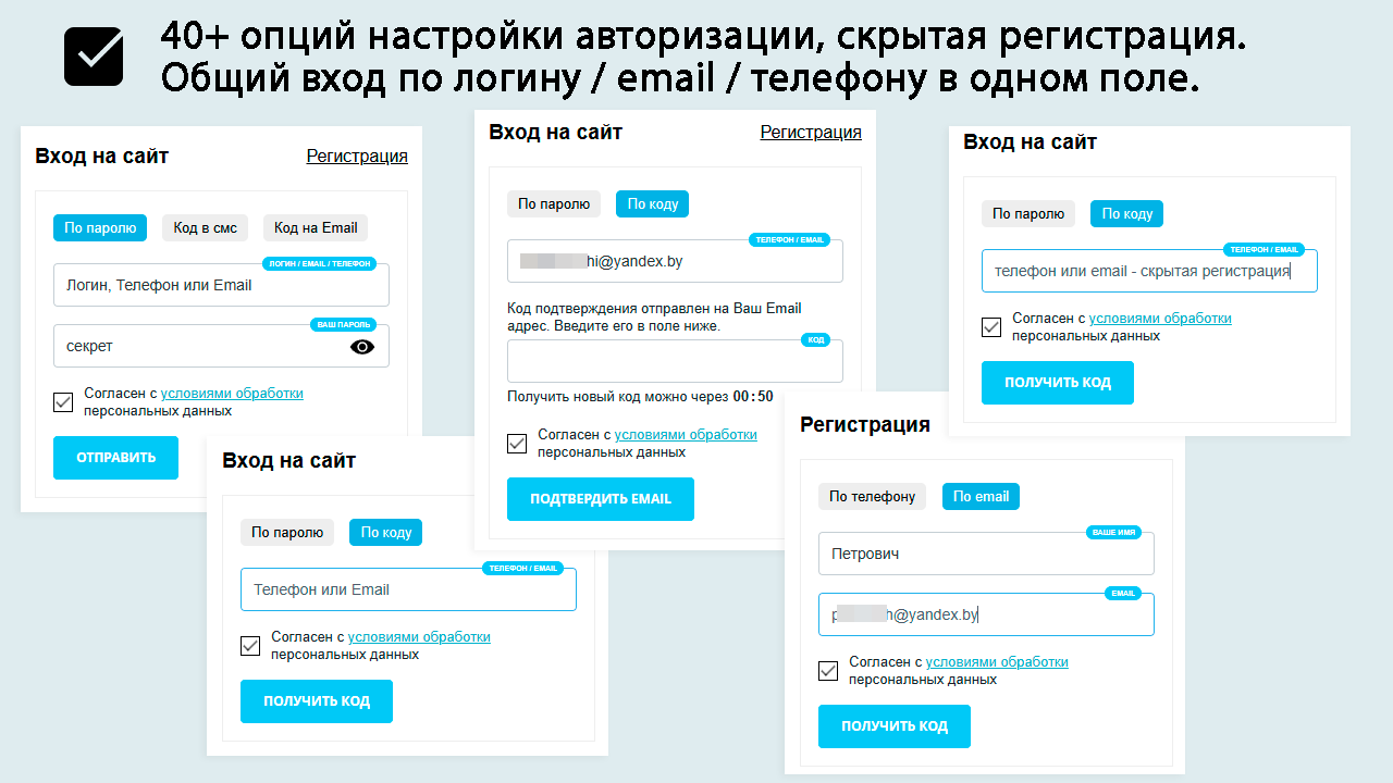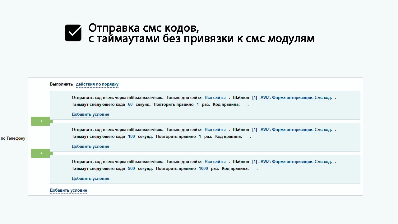 Если реализуете поддержку компонента в своем модуле, обязательно учитывайте, что обработчик на отправку кода может быть 1! Необходимо наличие опции включения/отключения данного обработчика в настройках ваших модулей.
