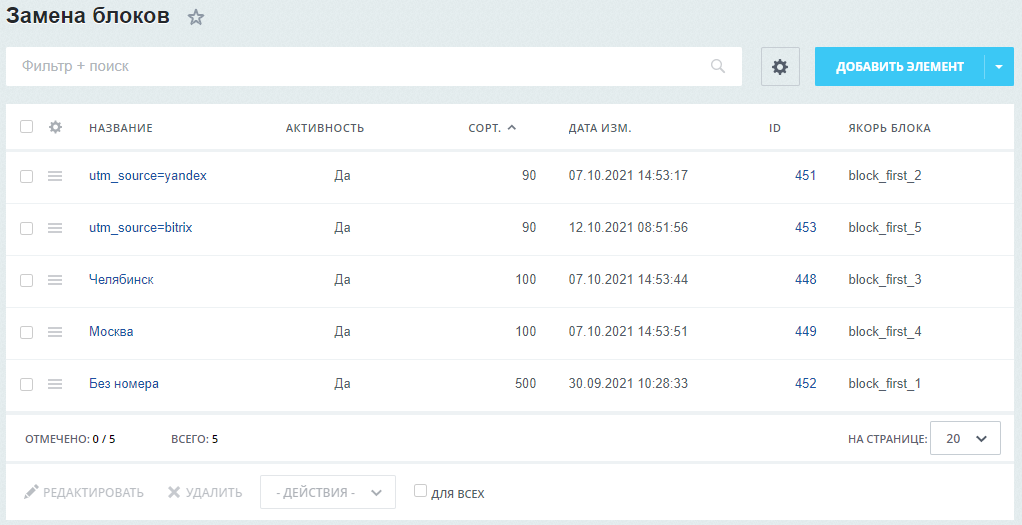 Наш модуль позволяет менять блоки в сайтах, созданных на встроенном конструкторе Сайты24 в 1С-Битрикс Управлением сайтом в соответствии с географией, источником перехода или по UTM меткам.Таким образом можно превратить ваш лендинг в мультилендинг или сделать A/B тестирование лендинга.