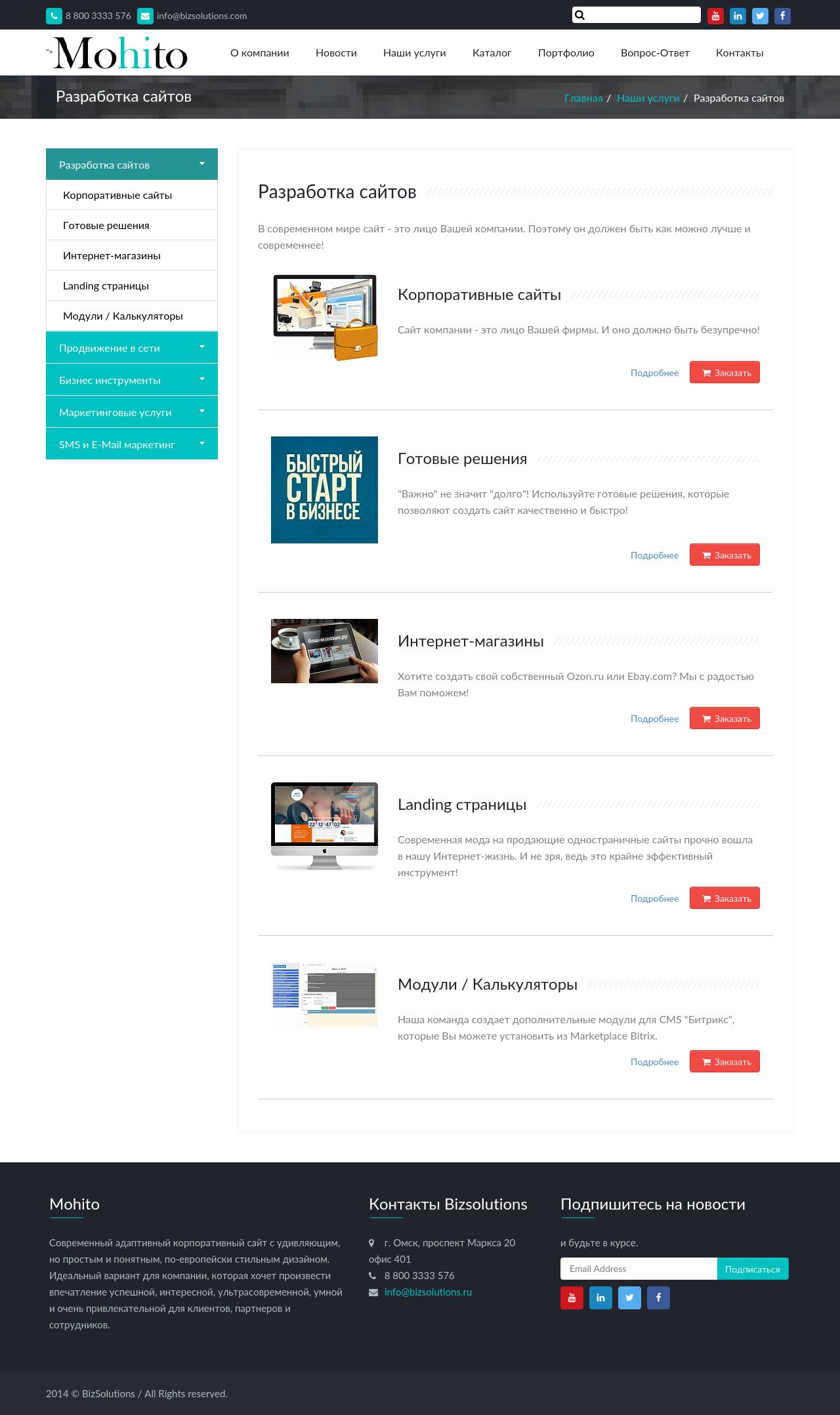 - Страница списка услуг в разделе с кнопками “Задать вопрос” и “Заказать услугу”, при нажатии на которые открывается форма обратной связи