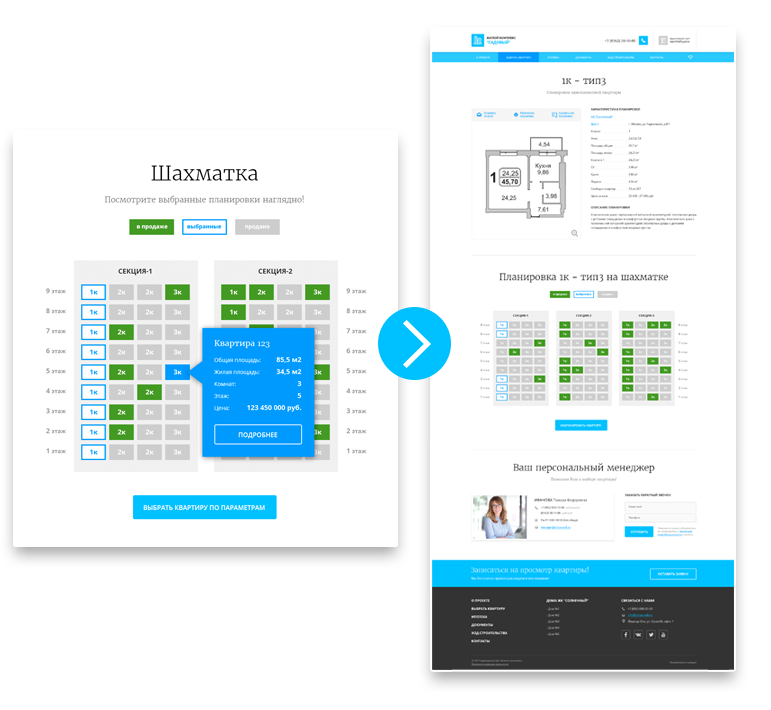 Выбрать квартиру на сайте застройщика можно двумя путями: традиционным – через фильтр подбора по заданным параметрам и более современным – путем поиска квартиры через планировки наглядно, через шахматку. Все понравившиеся квартиры будут добавляться в «Избранное» с дальнейшей возможностью отправки всего списка себе на электронную почту или сразу менеджеру по продажам.