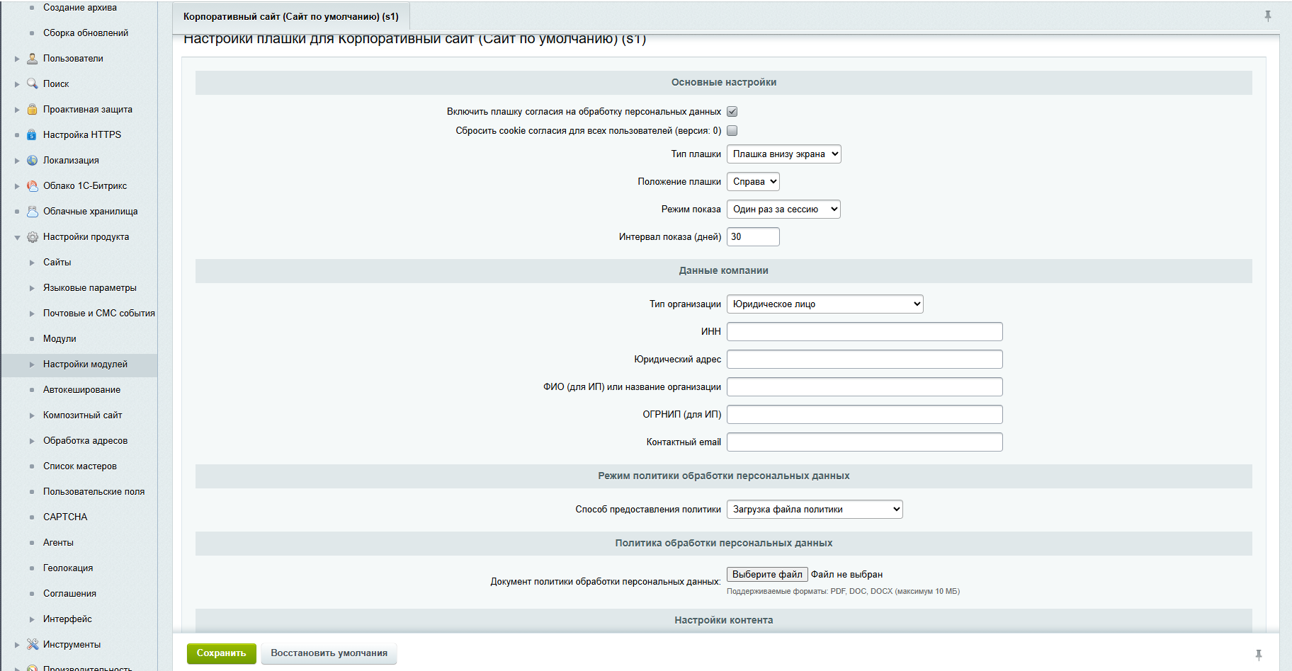 Модуль предназначен для управления уведомлениями об использовании cookie-файлов и баннерами согласия на обработку персональных данных на сайте в соответствии с требованиями Федерального закона №152-ФЗ «О персональных данных».