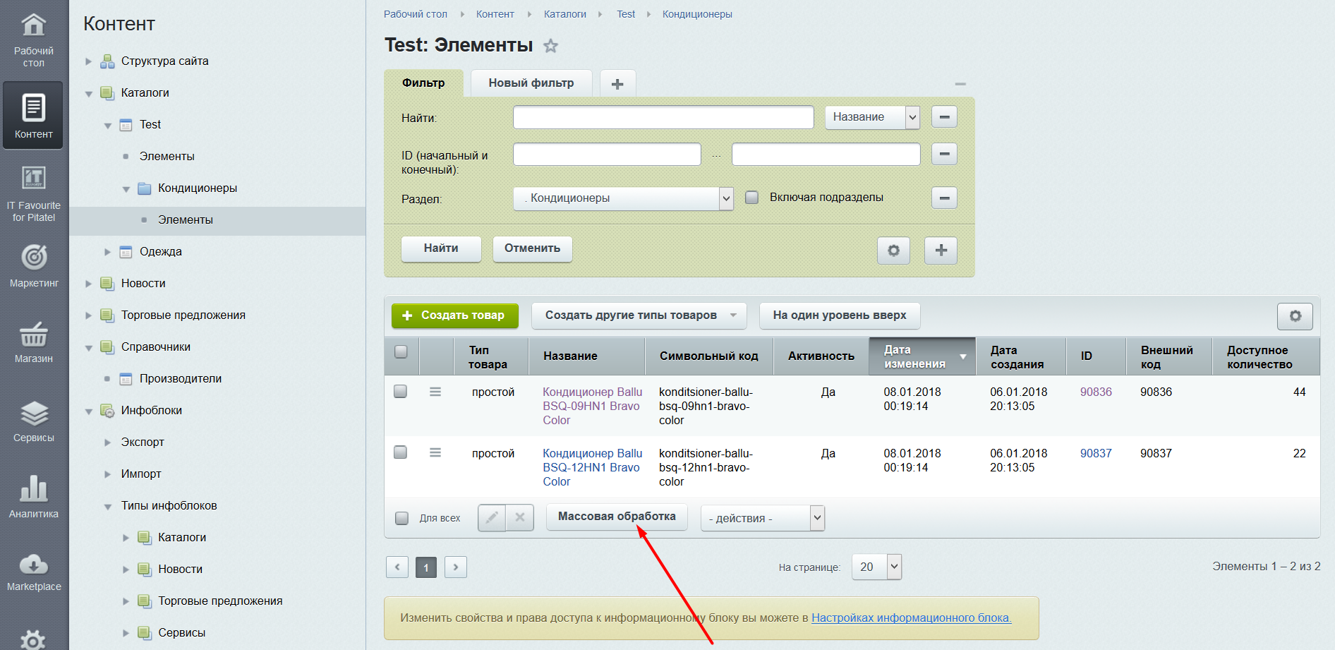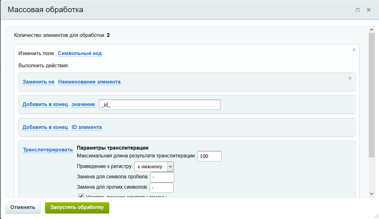 Решение предназначено для массового изменения полей/свойств элементов и разделов инфоблока.