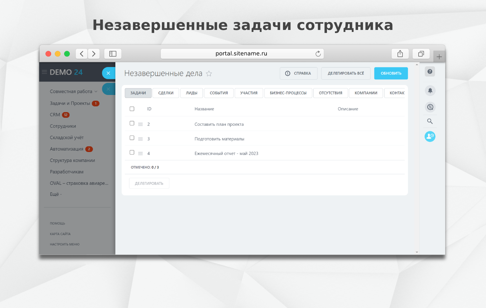 После завершения настройки модуля в профиле сотрудника появляется кнопка «Незавершенные дела». В слайдере можно просмотреть весь список дел сотрудника, сгруппированный по категориям. Если у задачи или события не оказалось ответственного, то руководитель может их делегировать прямо из модуля по отдельности, либо, выбрав все из одной или нескольких категорий.
