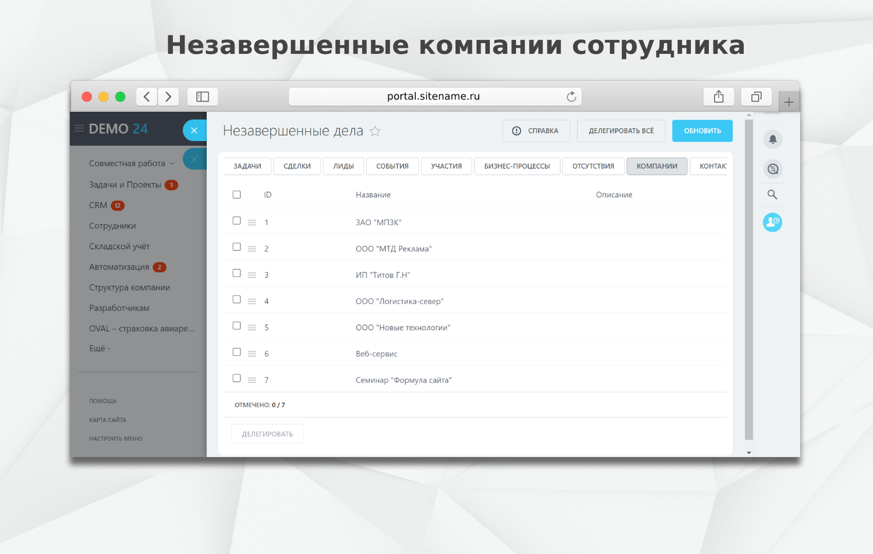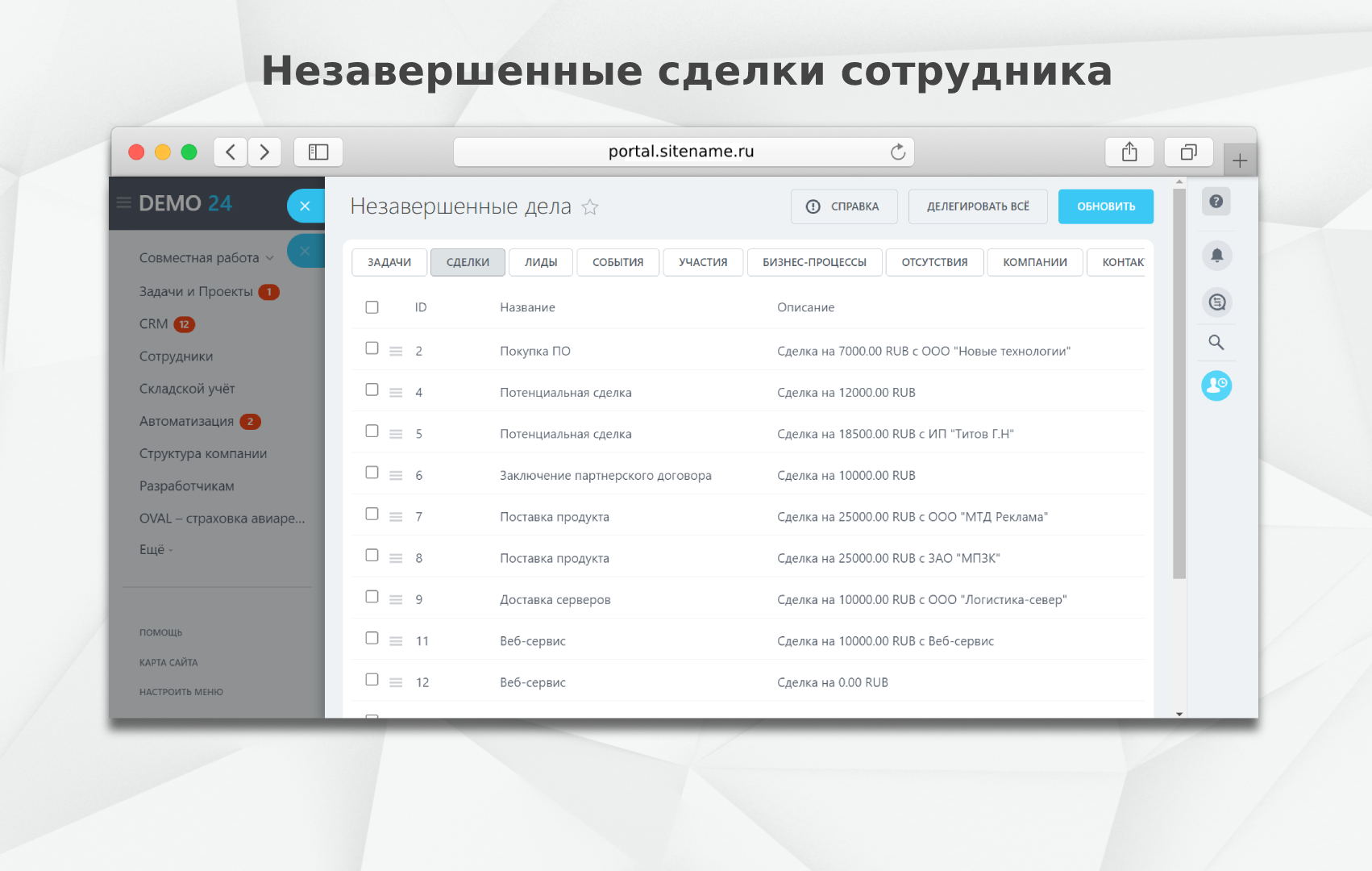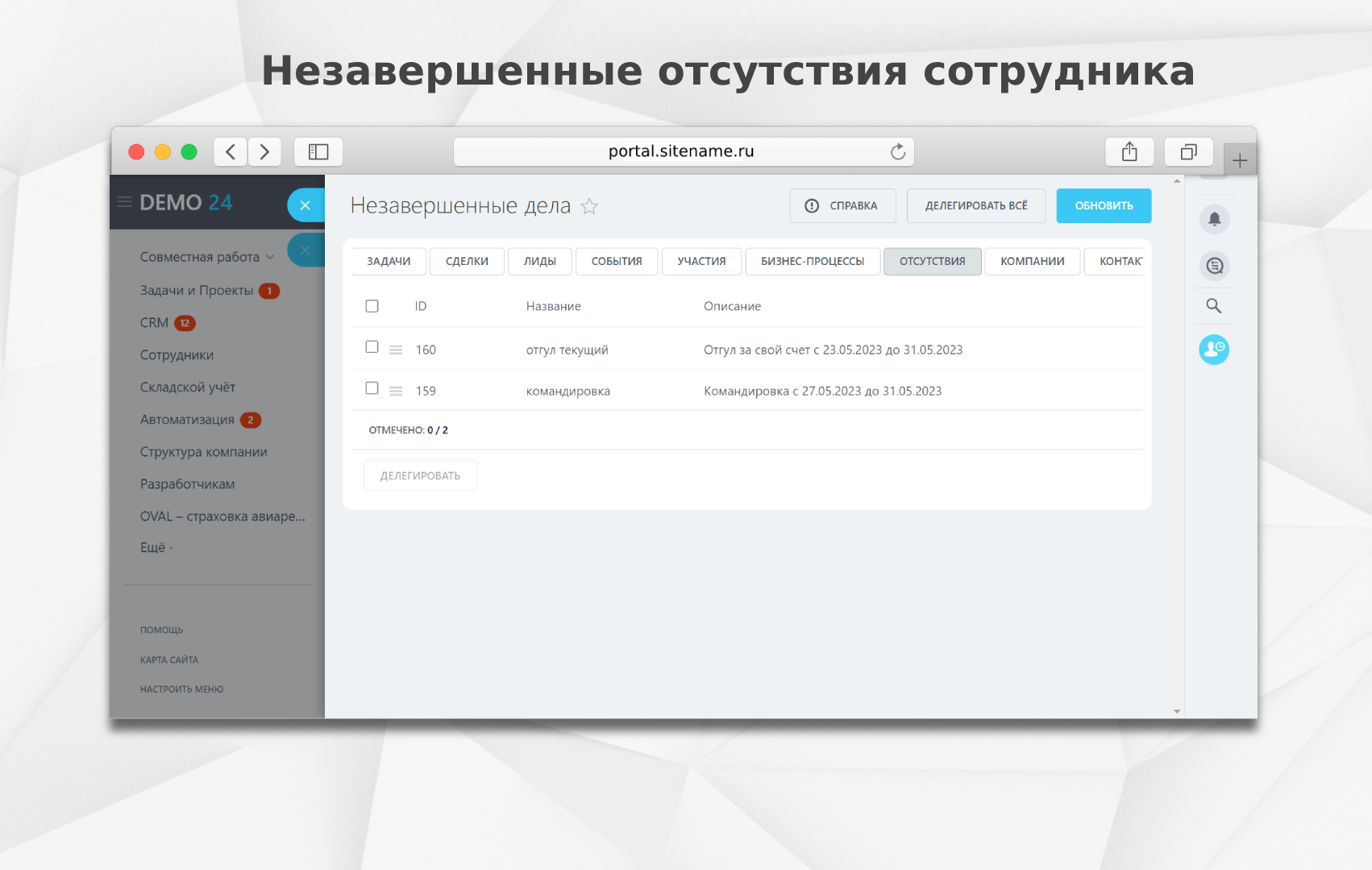 Особенность модуля состоит в том, что сотрудника нельзя будет уволить, если на нем остались незавершенные дела. Так дела уволенного или отсутствующего сотрудника не потеряются, а все работы по ним будут делегированы.