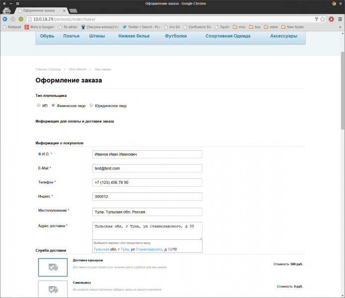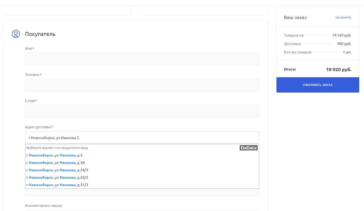- Почтовый адрес, разбитый по(КЛАДР, ФИАС). Без опечаток, с квартирой и индексом. Автоматически заполним индекс и местоположение для введенного клиентом адреса