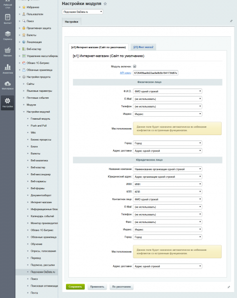 Приобрел данный модуль. Установил быстро. В Настройках указал напротив строк соответствующие значения, ну и зарегистрировался на DaData.ru для получения API ключа. Работает все как по часам. Все строки заполняет и подсказывает) Спасибо!