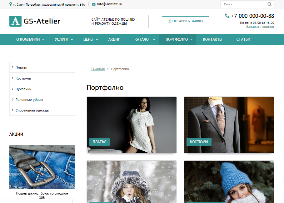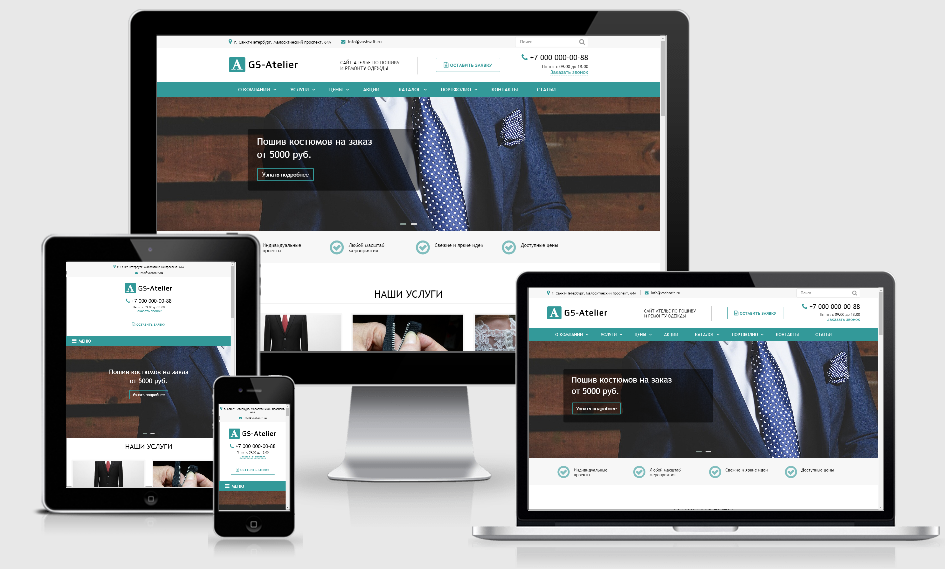 «GS: Atelier - Сайт ателье по пошиву одежды + каталог» – современный универсальный сайт для компаний и индивидуальных предпринимателей. Возможная интеграция: пошив одежды, ремонт одежды, швейное ателье, ремонт обуви, магазин по продаже одежды.