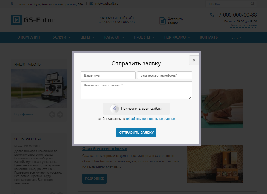 Сайт, который действительно продает. Главная страница оформлена в виде продающего лэндинга. Практически на всех основных страницах настроены отзывчивые формы для сбора контактов. Созданы основные страницы для презентации вашей компании: цены, акции, услуги, каталог, портфолио, контакты и т.д.