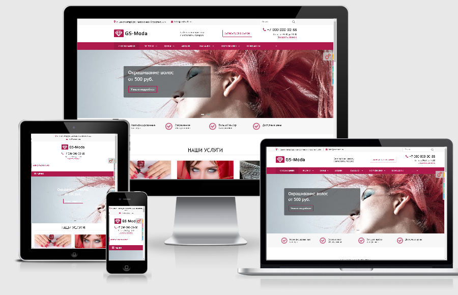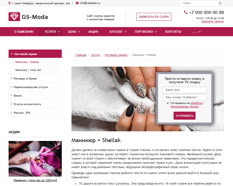 «GS: Moda - Сайт салона красоты с каталогом» – современный универсальный сайт для компаний и индивидуальных предпринимателей. Возможная интеграция: салон красоты, парикмахерская, барбершоп, студия красоты, маникюр и педикюр, реснички, СПА салон, массажные салон, татуаж и татуировки, макияж, визаж, интернет-магазин косметики.