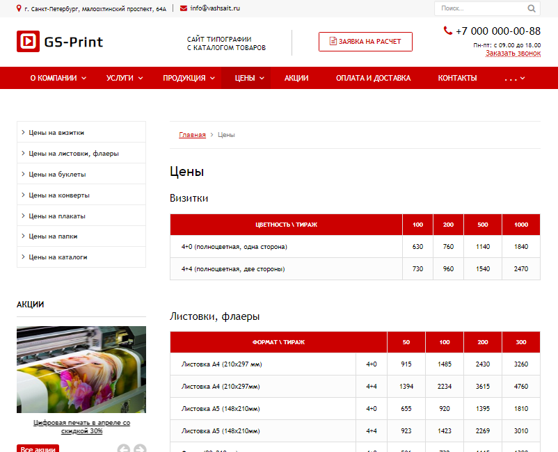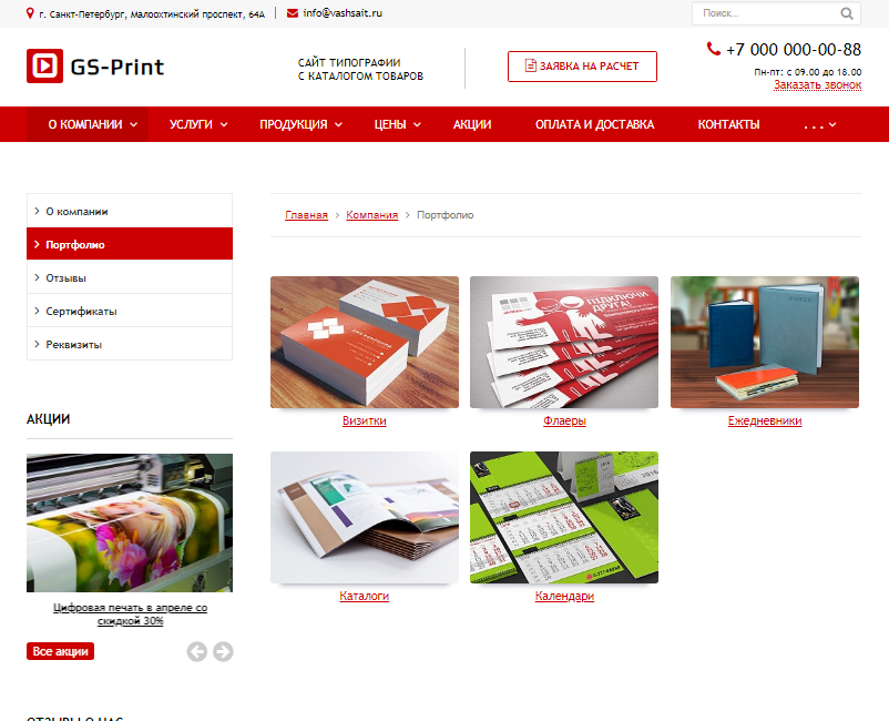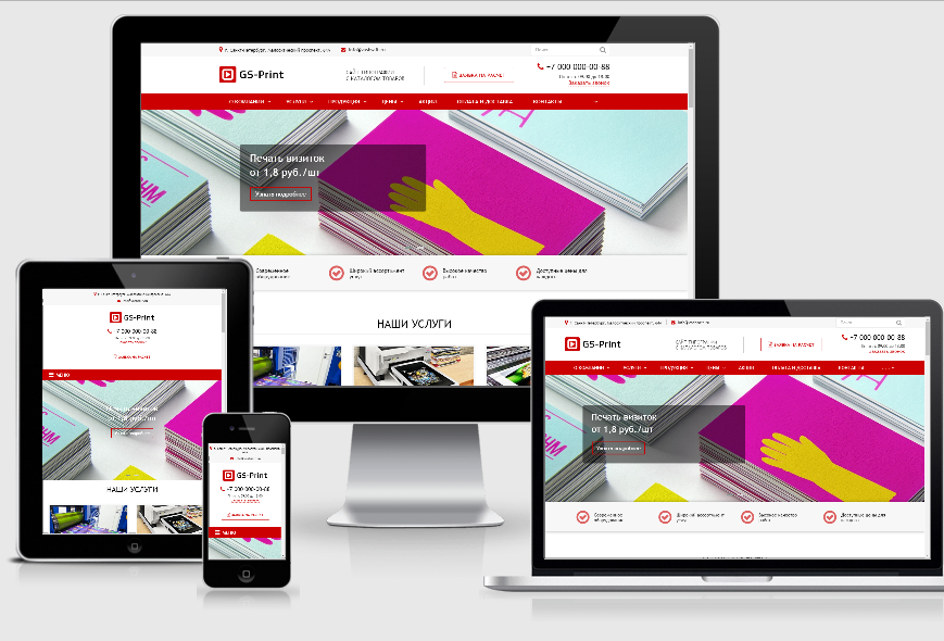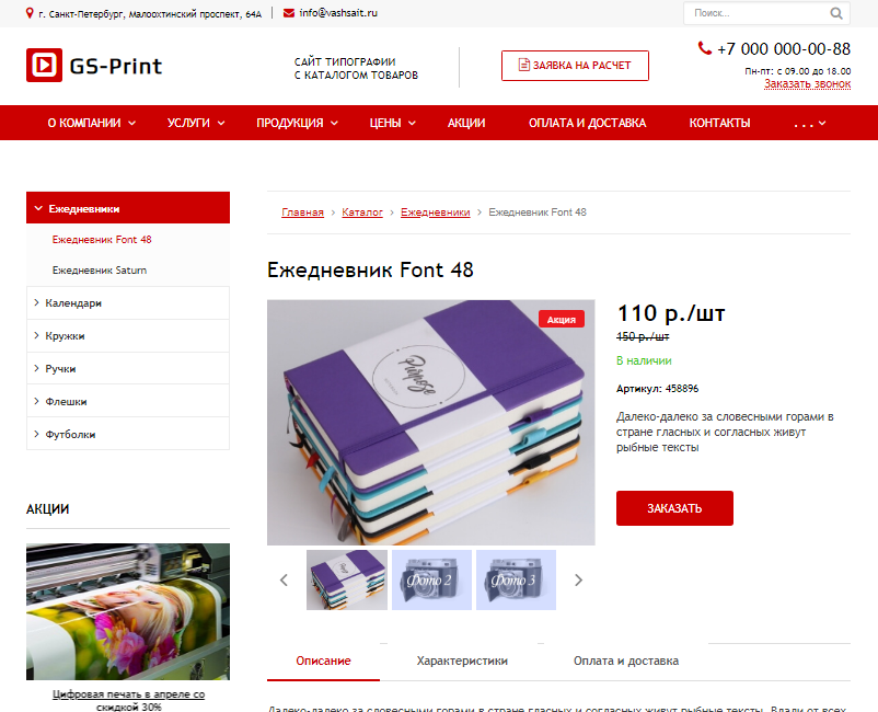 «GS: Print - Сайт типографии с каталогом товаров» – современный универсальный сайт для компаний и индивидуальных предпринимателей. Возможная интеграция: полиграфические услуги, услуги типографии, копировальный центр (копицентр), широкоформатная печать, офсетная печать, цифровая печать, печать визиток, печать листовок, печать буклетов, печать афиш, печать фото, печать на футболках, продажа сувенирной продукции, наружная реклама, рекламное агенство.