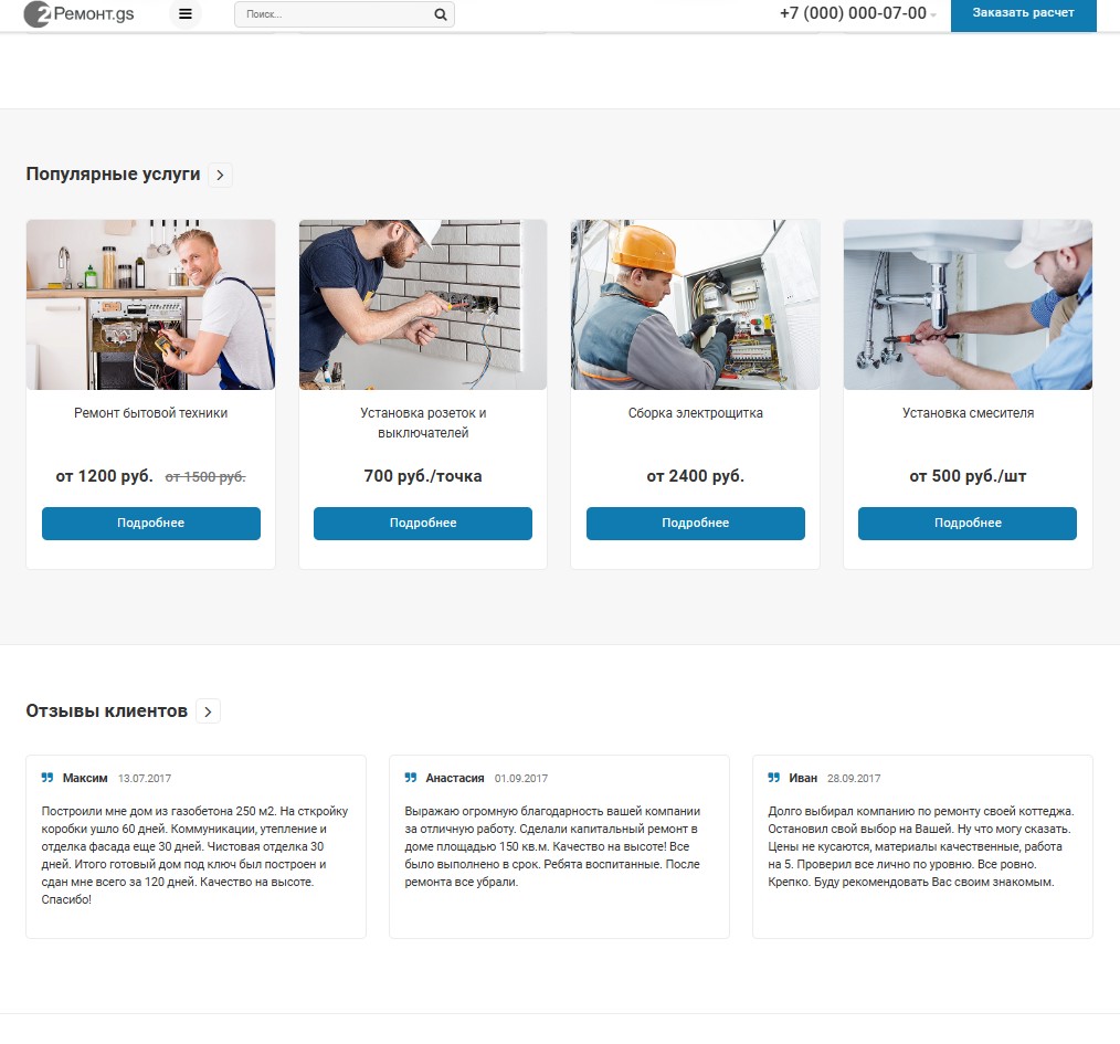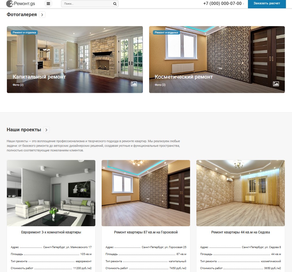 «Ремонт.GS - 2.0 сайт компании по ремонту квартир – универсальный, адаптивный сайт для компаний оказывающих услуги в строительной сфере. Возможная интеграция: ремонт квартир, ремонт офисов, ремонт коттеджей.