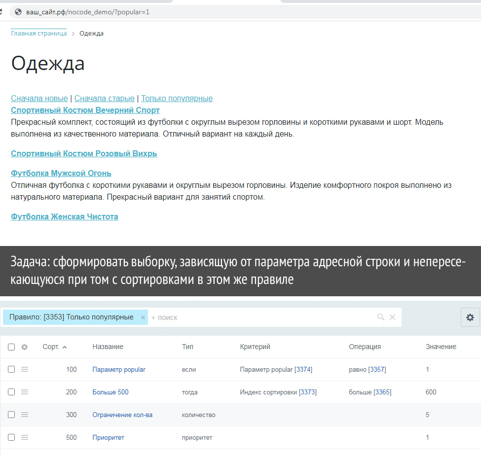 Например, в правиле можно указать, что показать нужно 2 самых просматриваемых товара - сначала сортируем по количеству просмотров, затем берём первые два