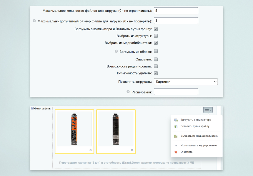 - Ограничение по типу файла: любые файлы, только изображения, файлы с заданными расширениями;