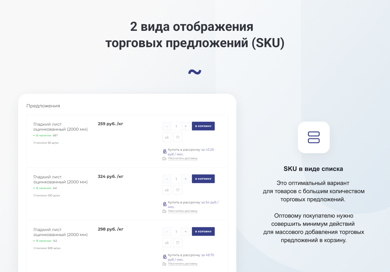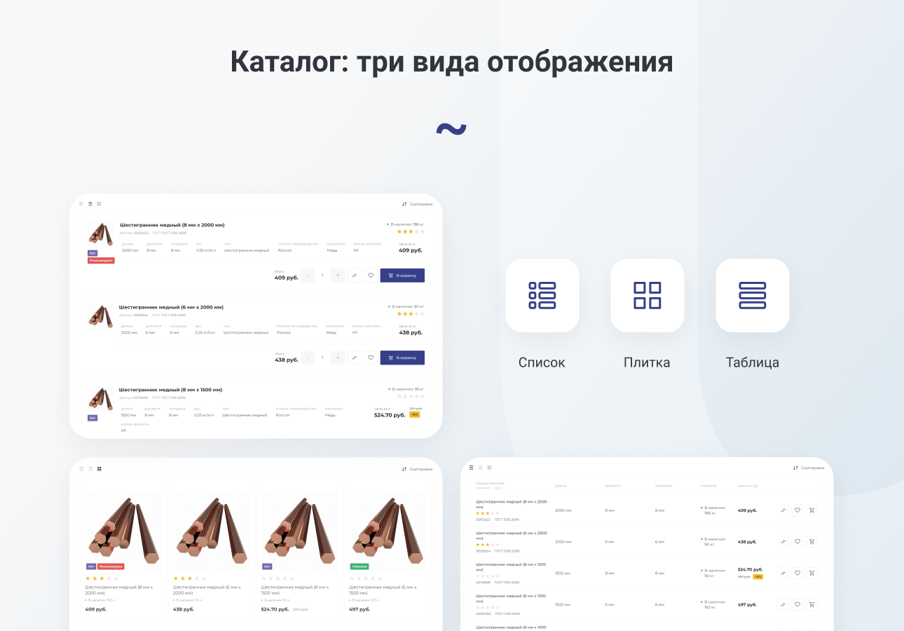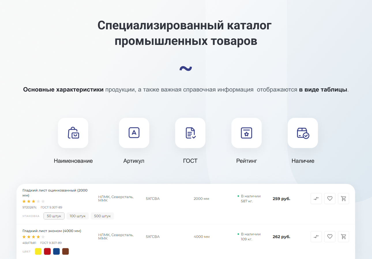 характеристик (марка стали, ГОСТ, артикул и т.д.). Поэтому мы реализовали табличный листинг,