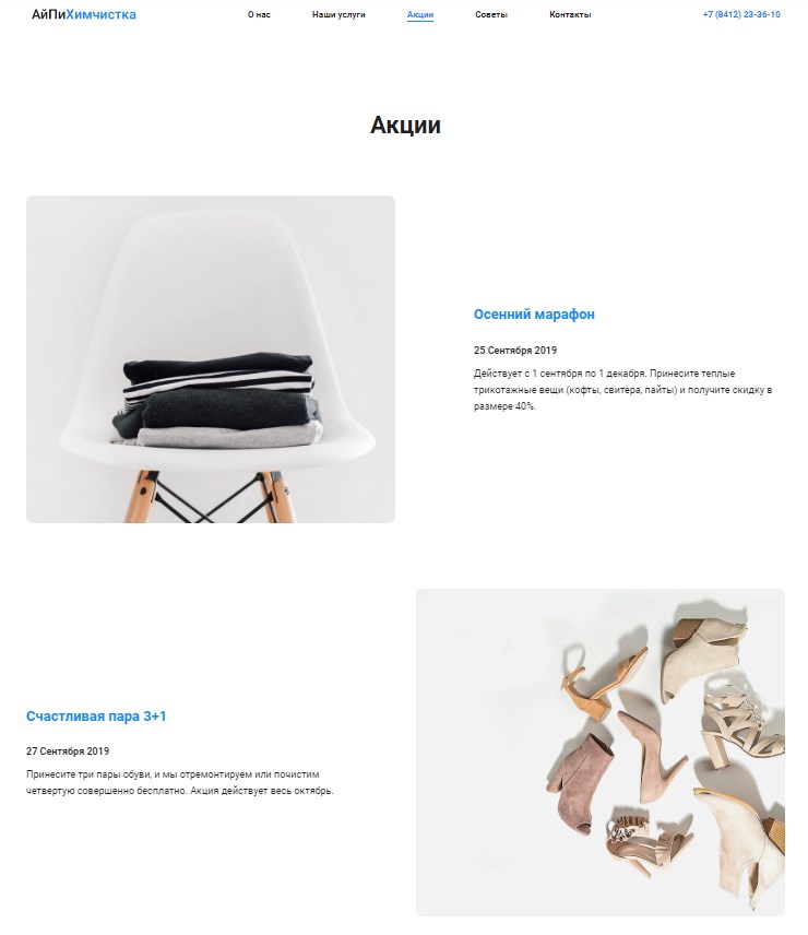 Шаблон идеально подходит для химчистки. Первое окно дает представление о деятельности компании и привлекает внимание посетителя действующими акциями. Современный стильный дизайн в бело-голубых оттенках символизирует чистоту и хорошо отражает тематику сайта. Чуть ниже — презентация организации и обоснование ценности с фотоиллюстрациями (факторы, выделяющие компанию среди конкурентов).