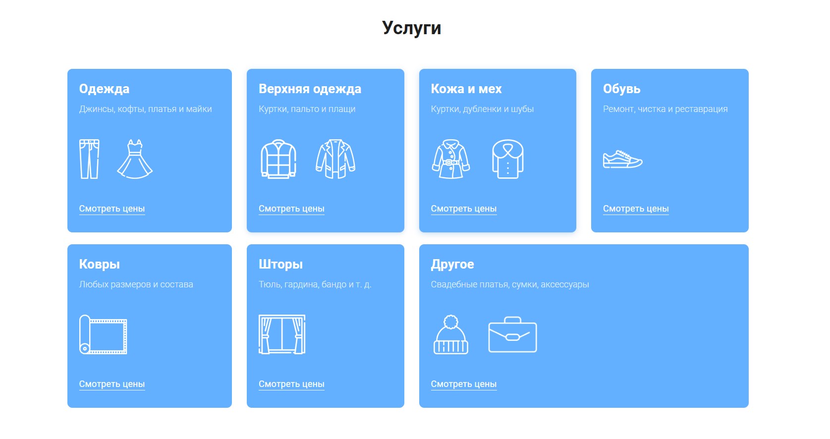 Удачное решение — перечень услуг реализован в виде иконок и разделен по категориям. Всего один клик — и посетитель знакомится с действующими ценами. Страница завершается отзывами клиентов и СТА-кнопкой, призывающей заказать обратный звонок.