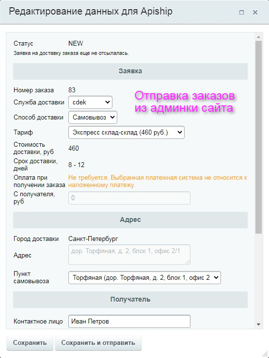 - Передача заказа в личный кабинет службы доставки после его редактирования и подтверждения в панели администрирования 1С-Битрикс;
