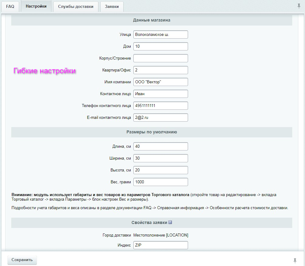 - Вывод возможных вариантов доставки в зависимости от размеров и веса товара;