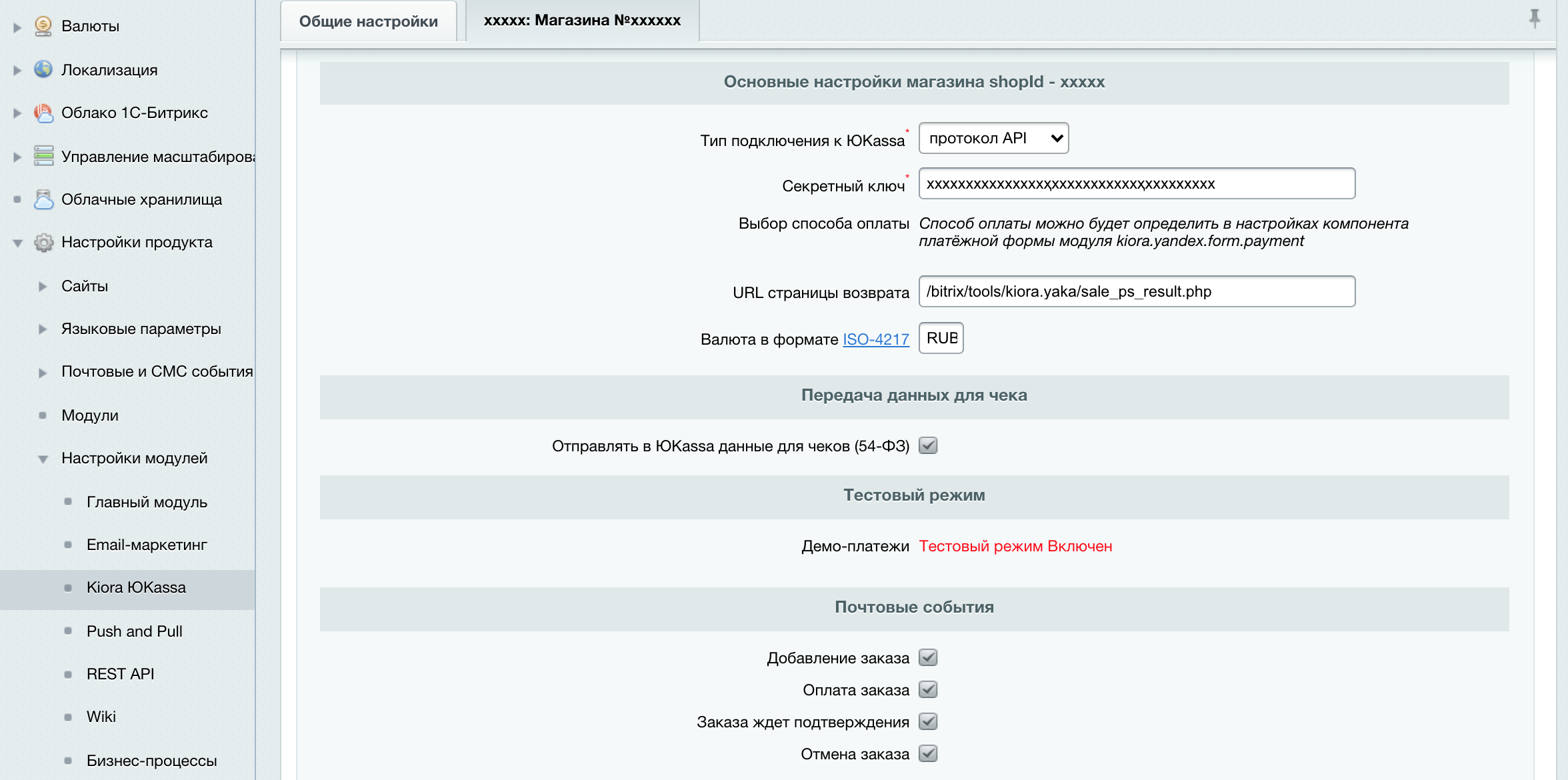 - Поддерживает передачу в онлайн кассу данных чека в формате ФФД 1.05 через ЮКассу для дальнейшей передачи партнёрам - Атол онлайн, Модуль.Касса, Orange Data, Бизнес.Ру Онлайн-Чеки.