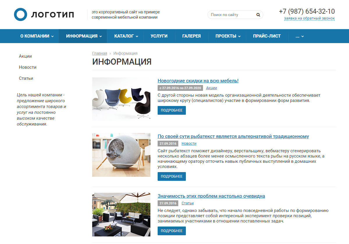- Информационная лента (акции, статьи, новости);