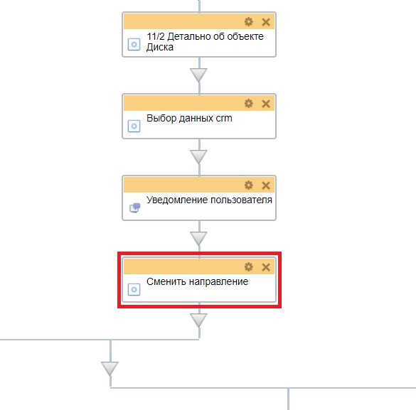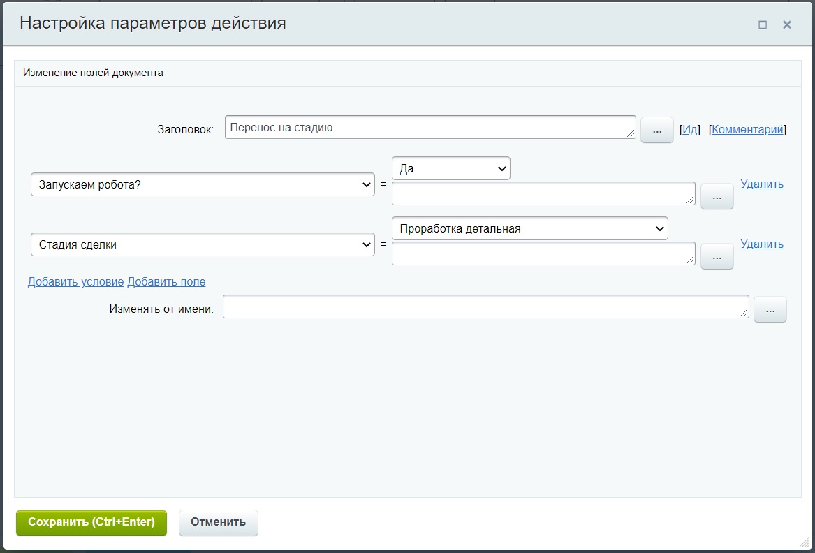 3. Перенос сделки. Содержит 2 действия: "Обновить страницу сделки" и "Изменение документа". В действии "Изменение документа" есть 2 поля: "Стадия сделки", в качестве значения выбирается та стадия сделки направления "Продажа оборудования", на которую необходимо перенести сделку из направления "Прогрев базы" и еще одно пользовательское поле типа "Да/Нет". Если значение поля равно "Да", запускается работа робота, который выводит задание на новую стадию сделки.