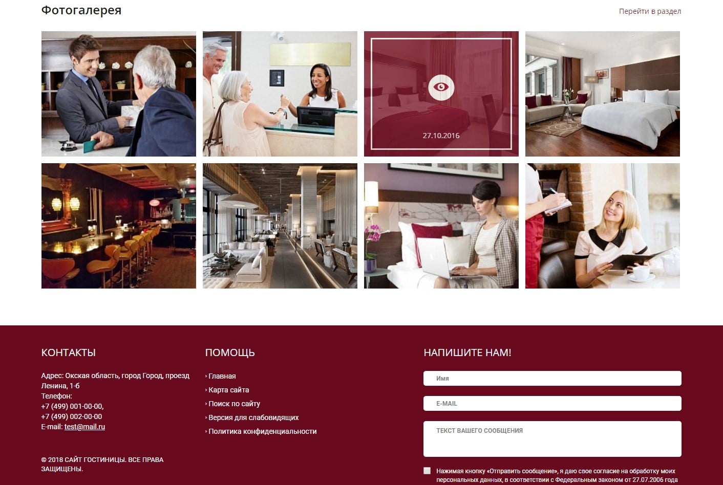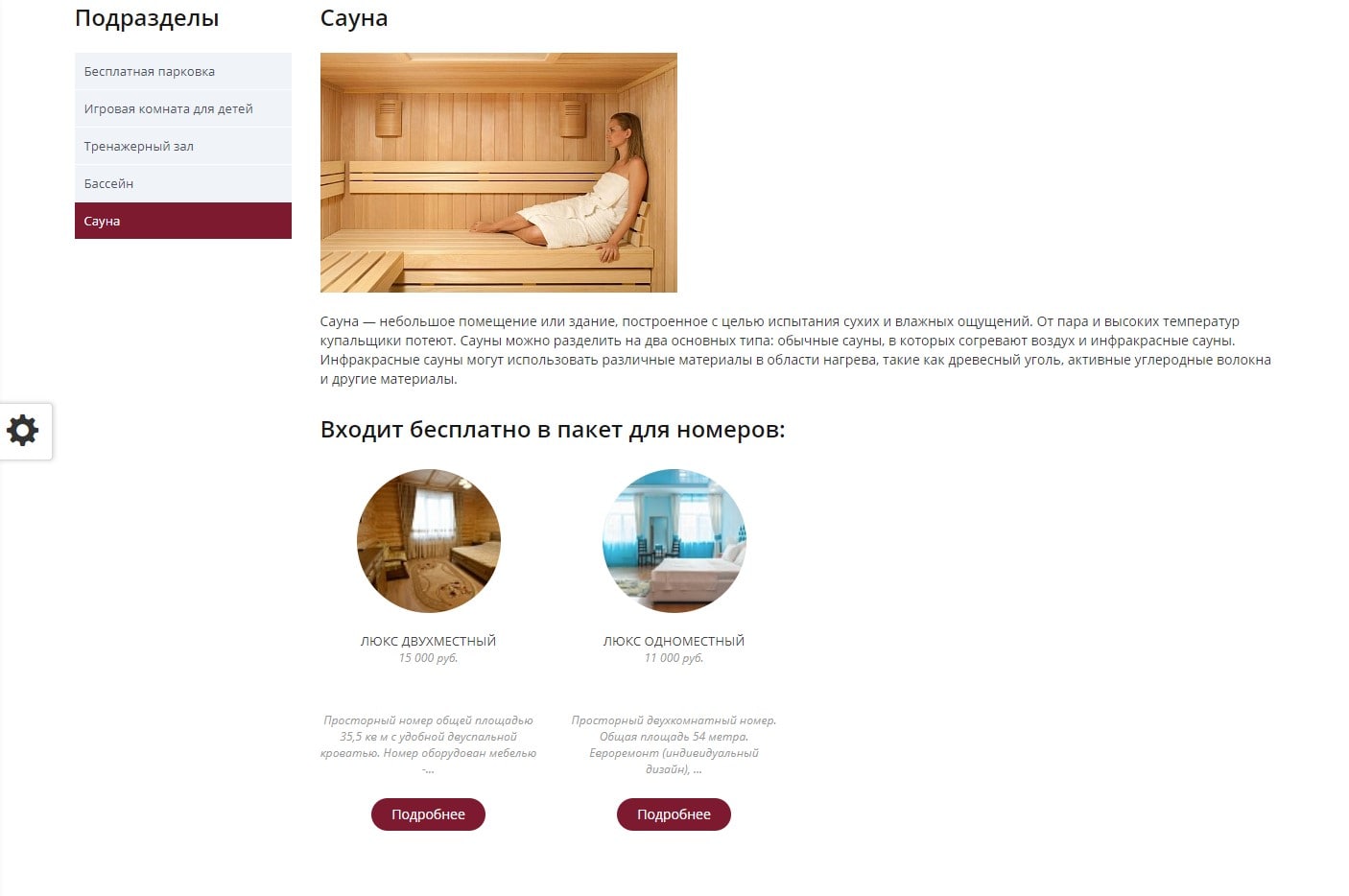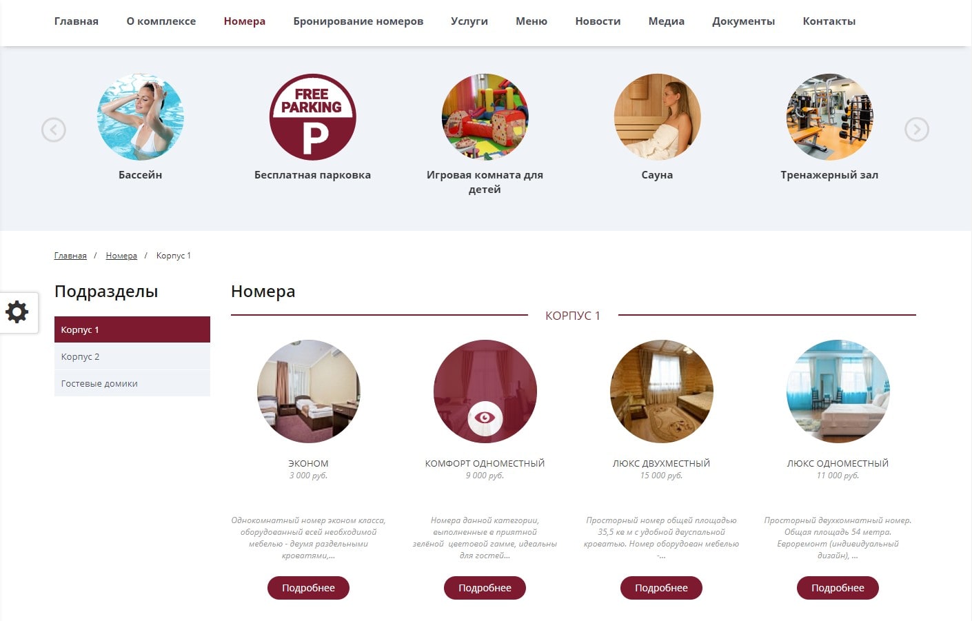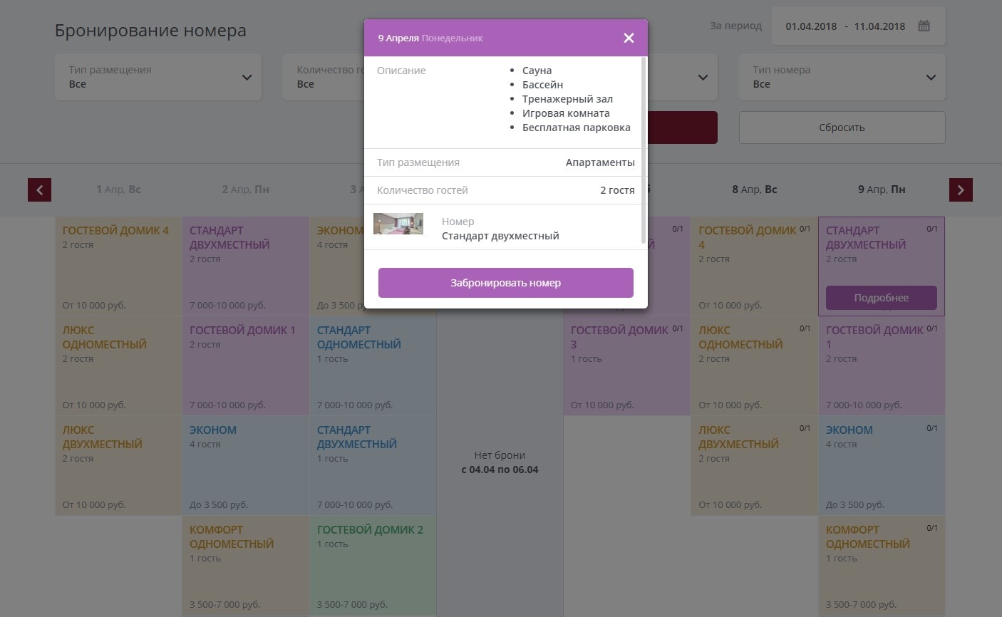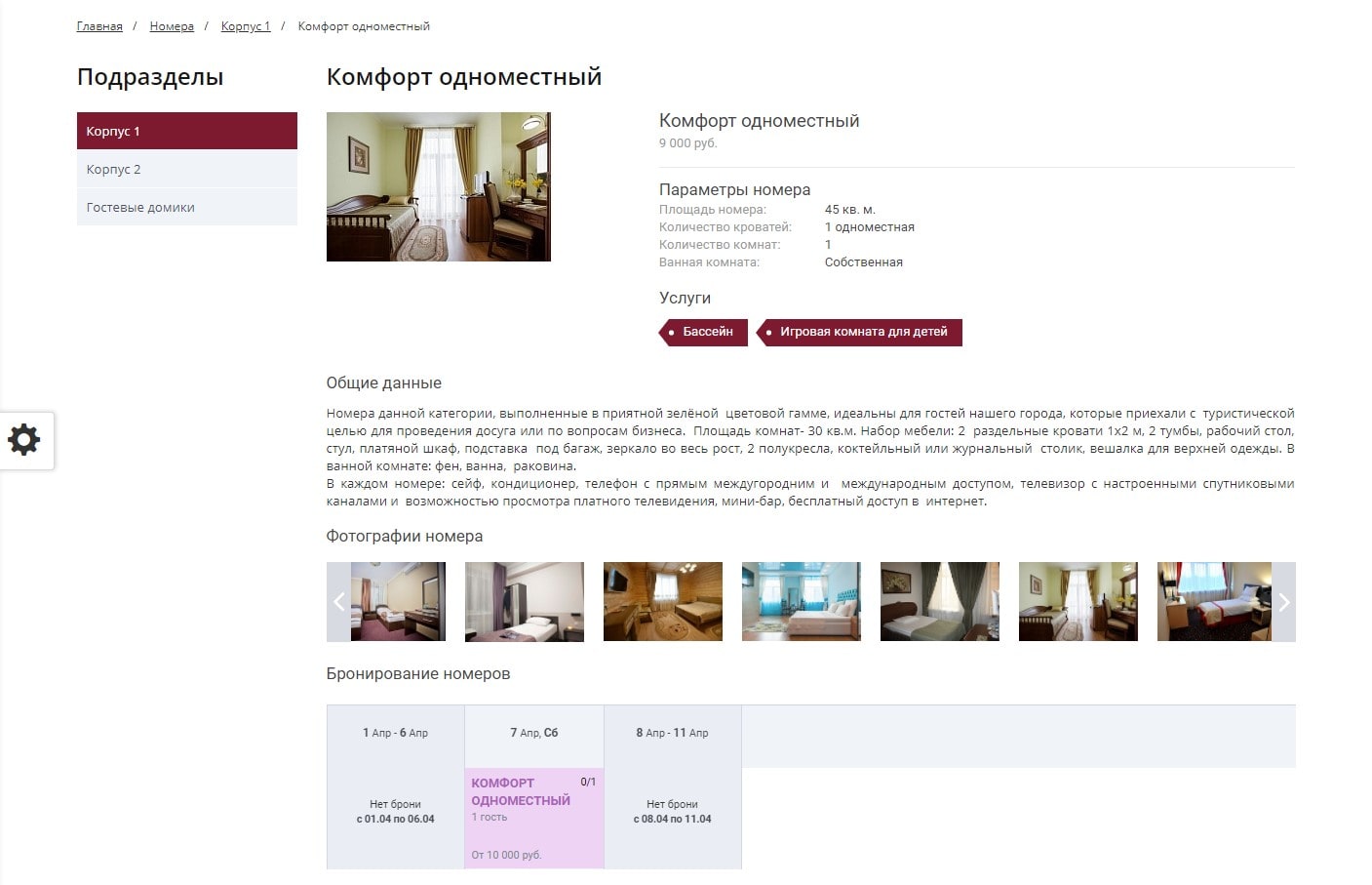 - Детальная страница каждого номера с подробной информацией о характеристиках, его фотографиями, а также блоком бронирования.