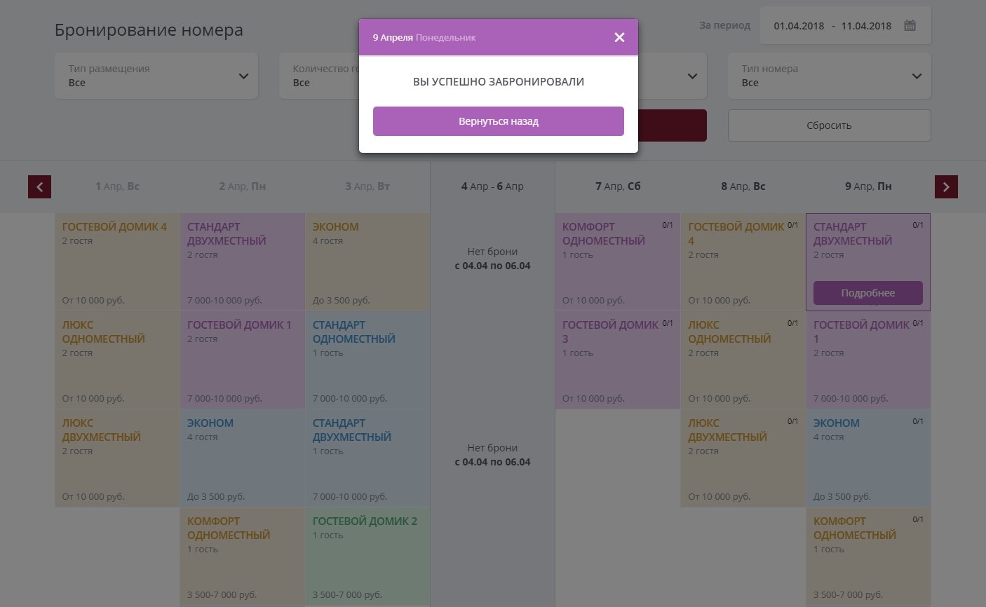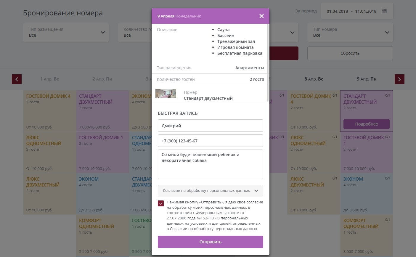 - Модуль бронирования, позволяющий бронировать понравившийся номер, домик, квартиру и т.д.