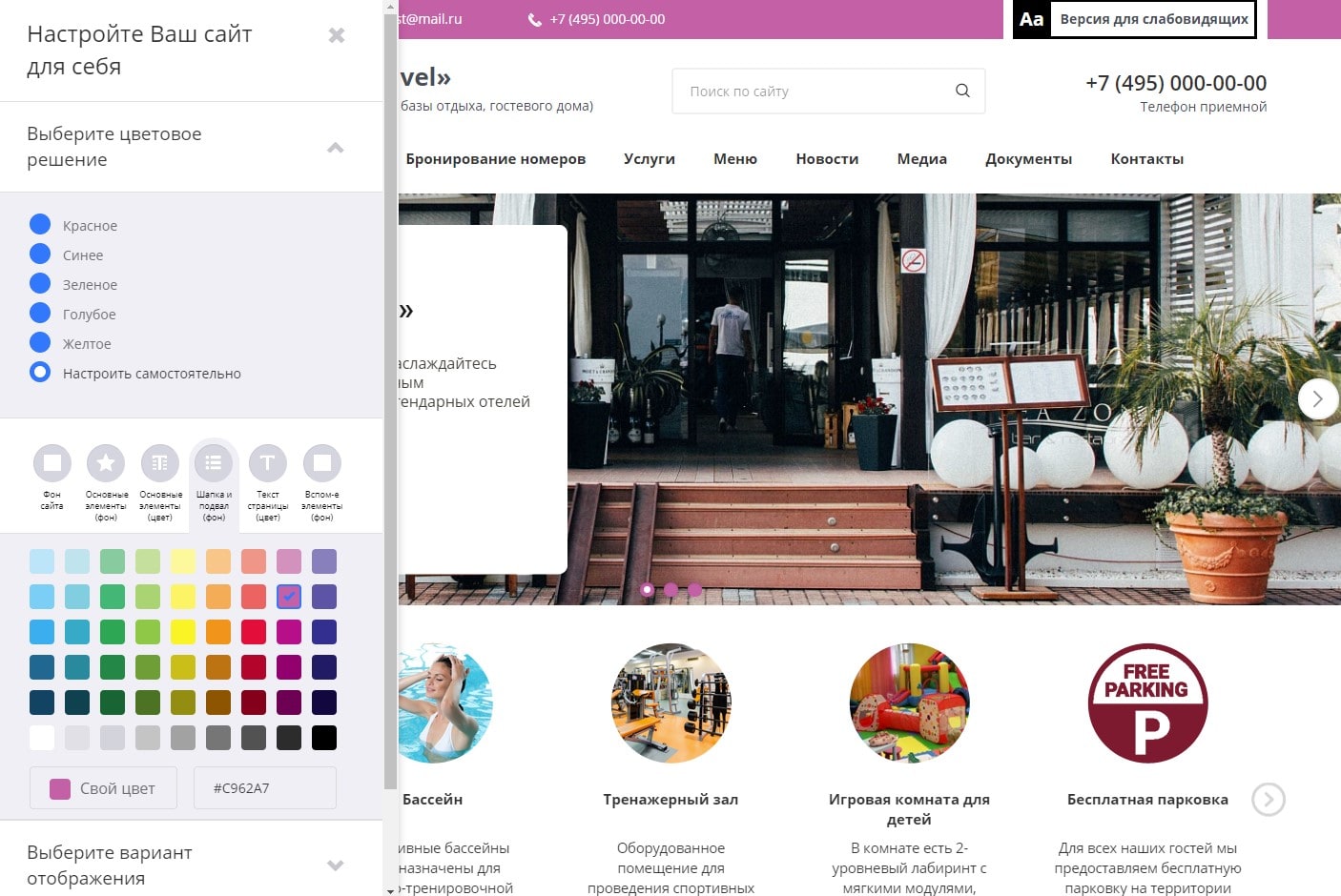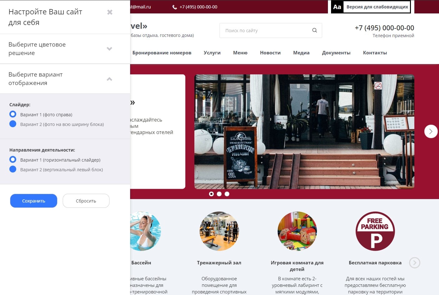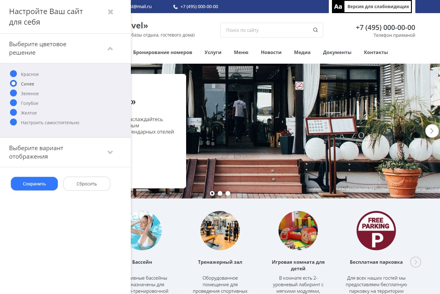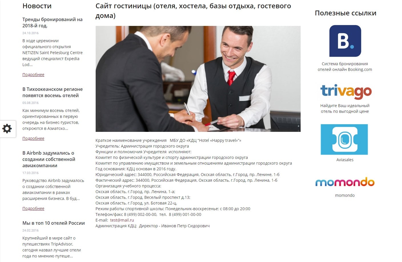 Адаптивная верстка для использования сайта на любых устройствах, множество персональных настроек. Удобная и быстрая форма бронирования с календарем.