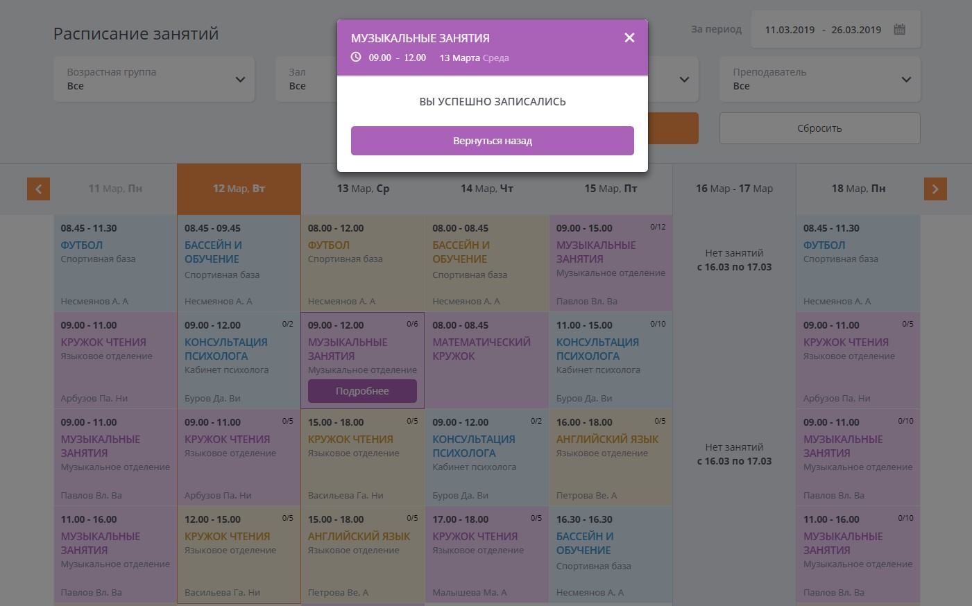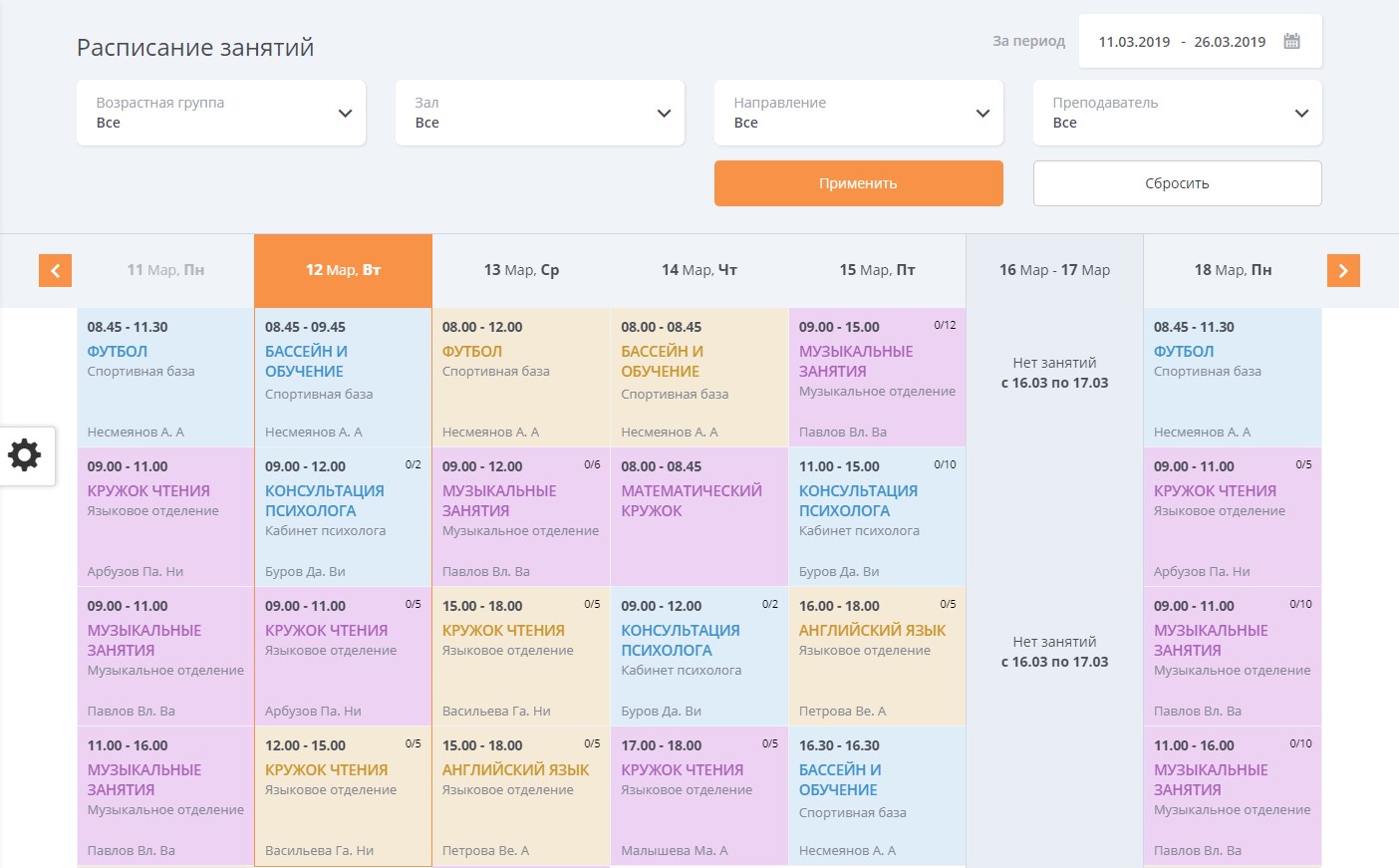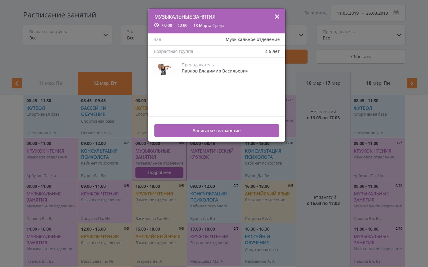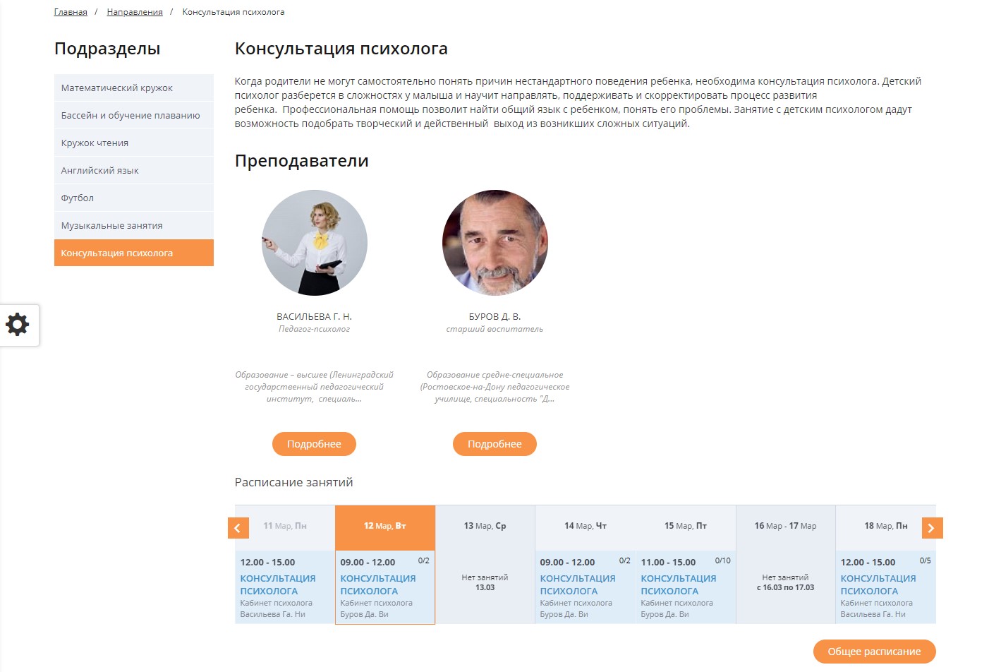 - Для каждого направления предусмотрен собственный раздел со списком преподавателей/воспитателей и расписанием.