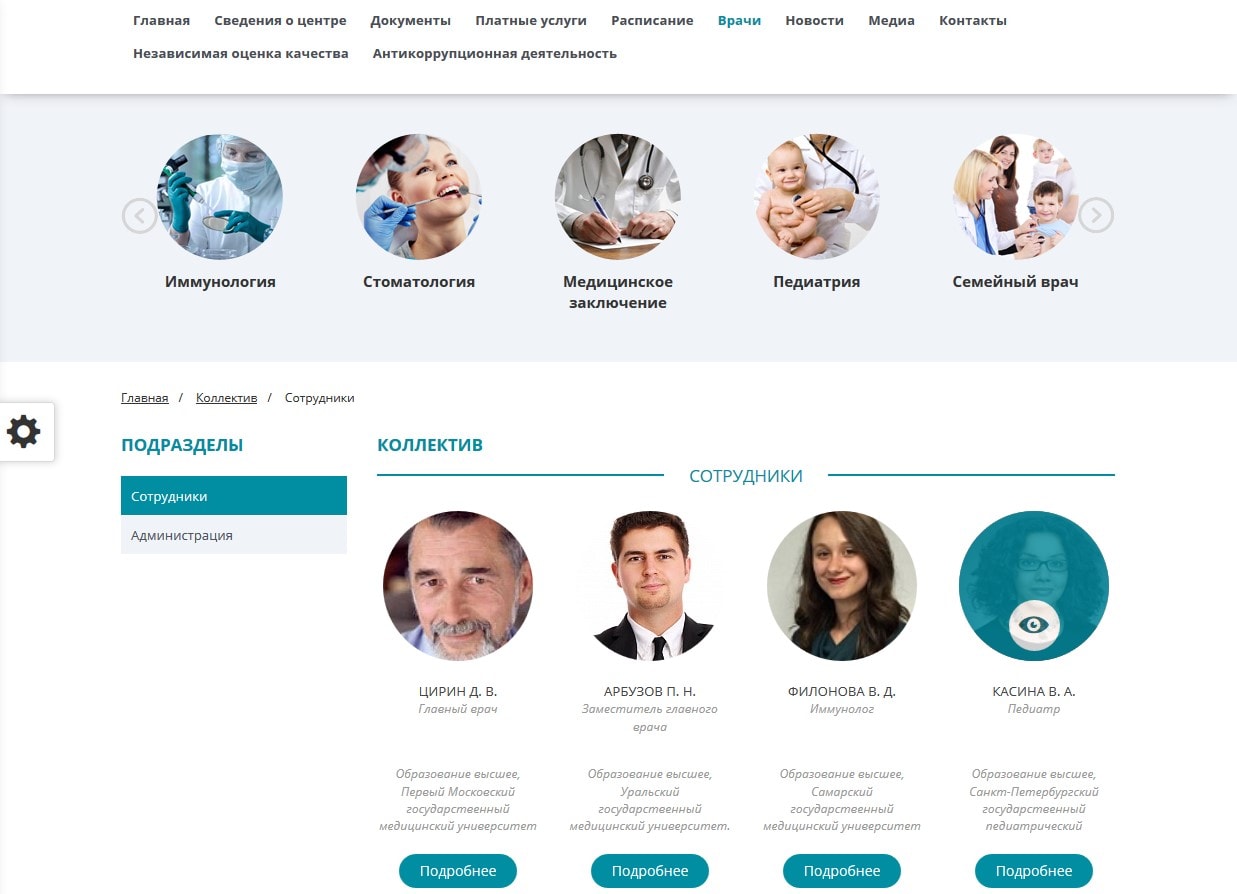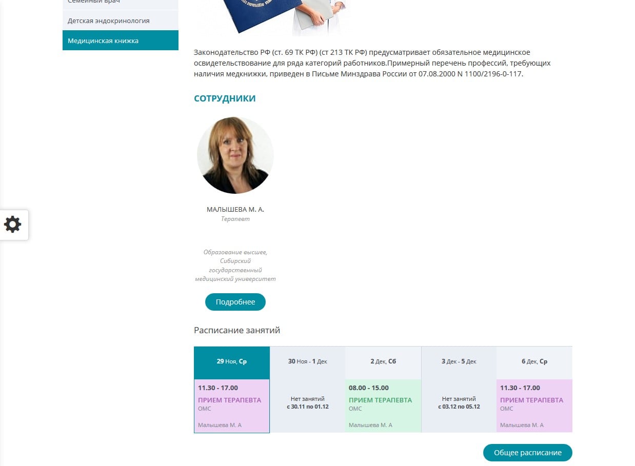 - Для каждого направления деятельности предусмотрен собственный раздел со списком врачей и расписанием приема