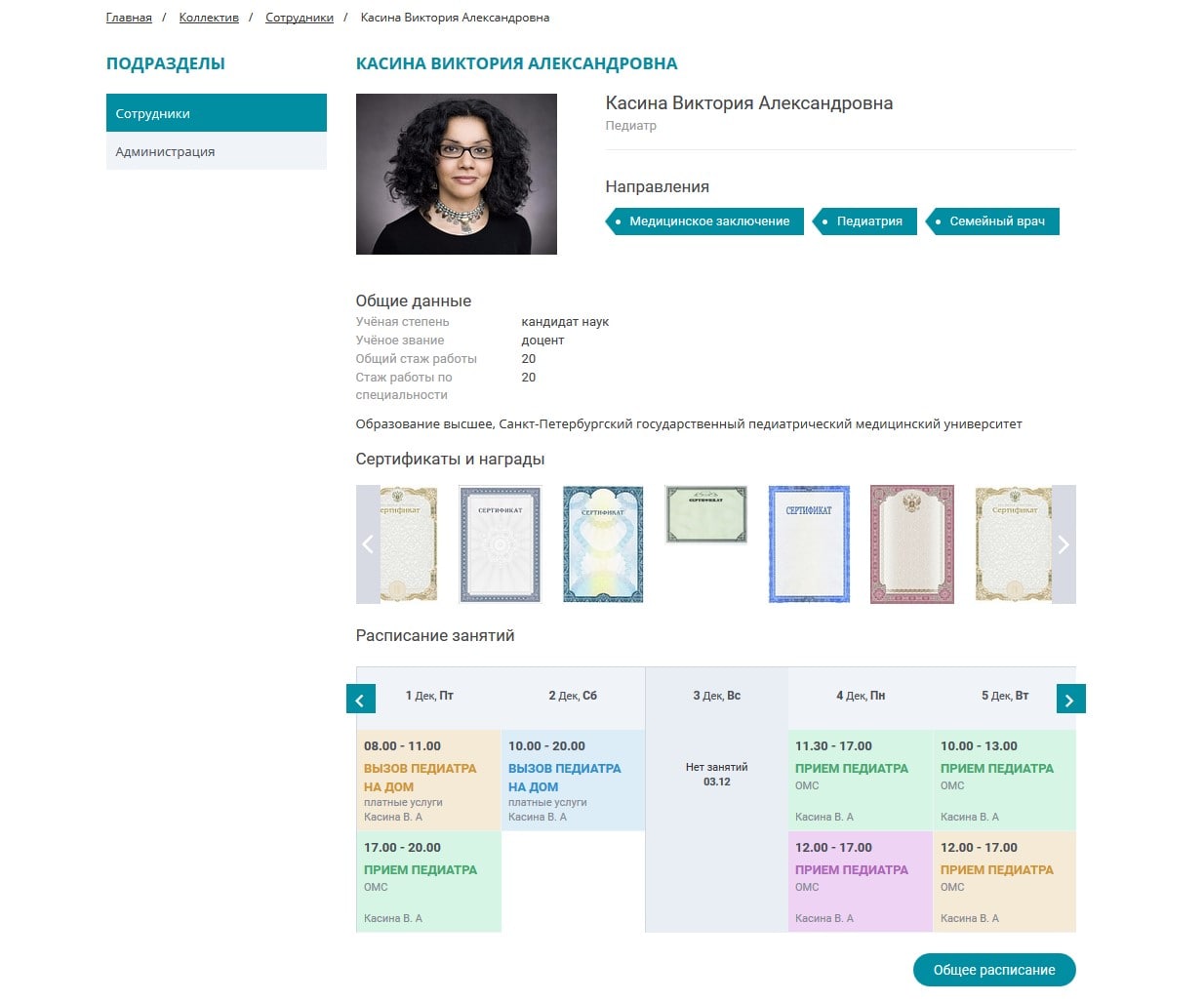 - Личная страница врача с его заслугами и наградами, а так же блоком расписания приема, который он ведет.