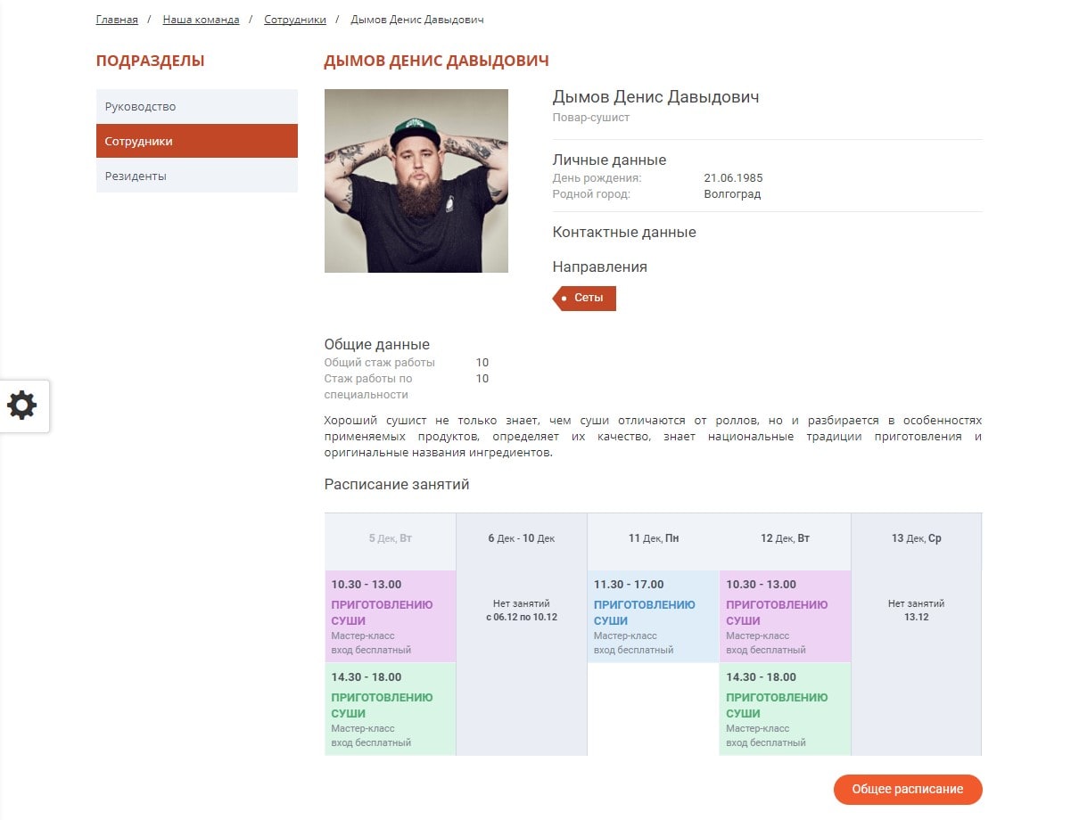 - Для каждого направления деятельности предусмотрен собственный раздел со списком сотрудников и расписанием.