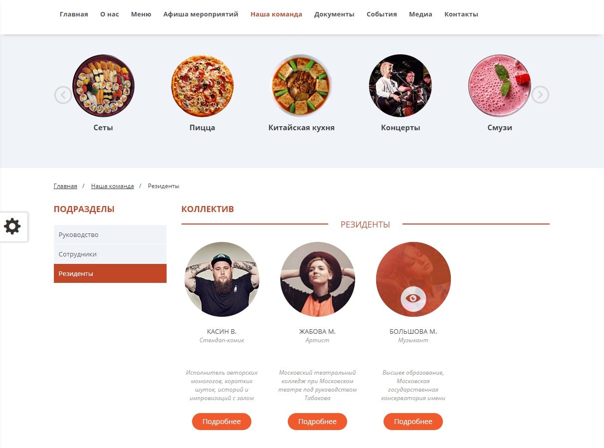 - Личная страница каждого сотрудника с подробной информацией, с его заслугами и наградами, а так же блоком личного расписания (афишей) с возможностью записи.