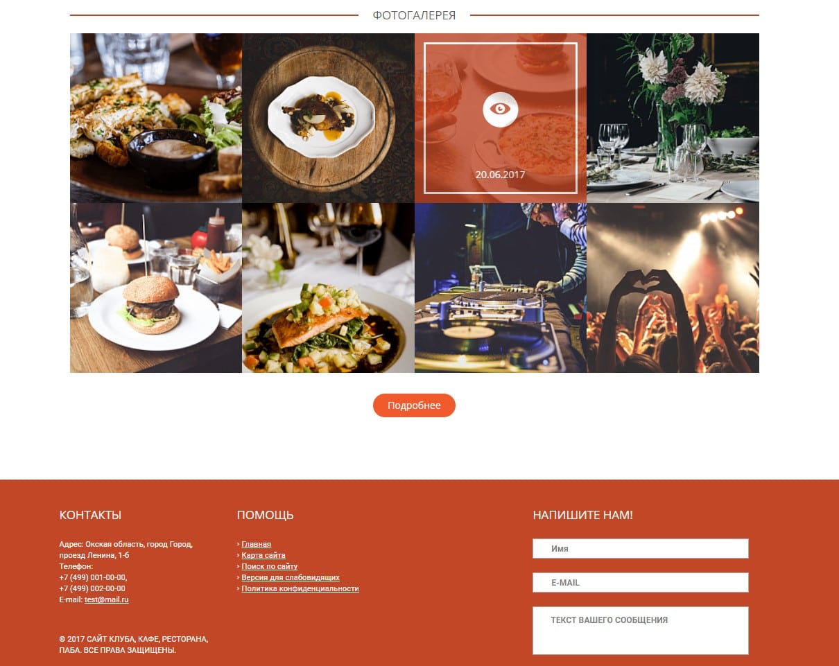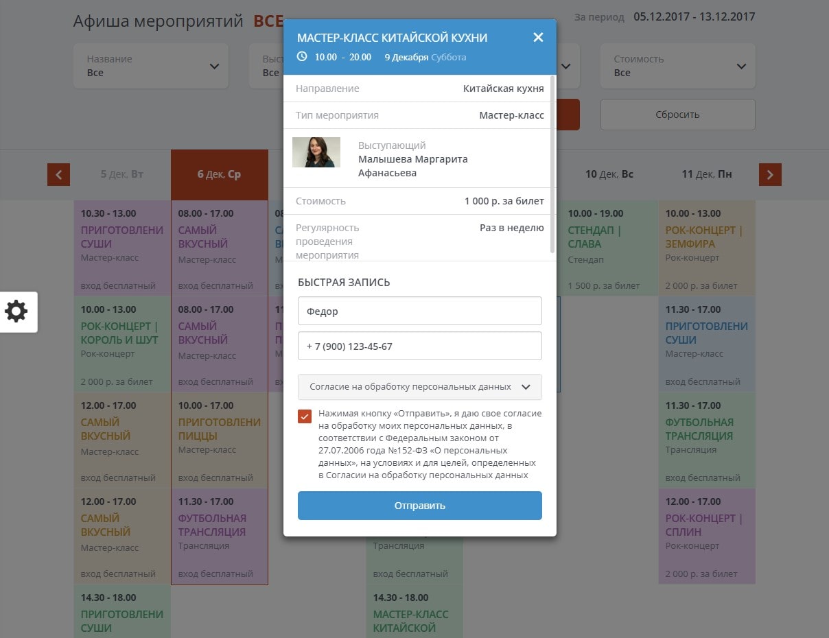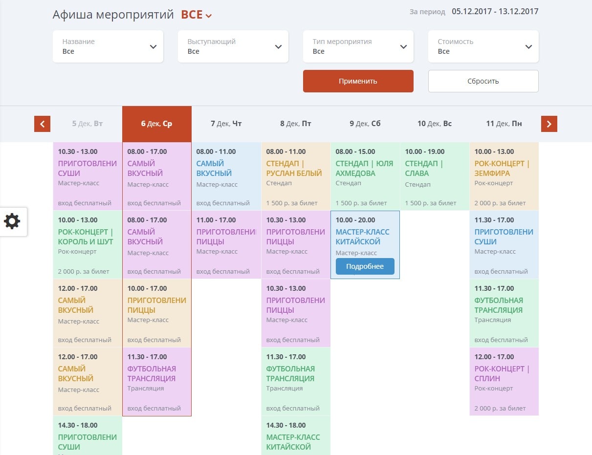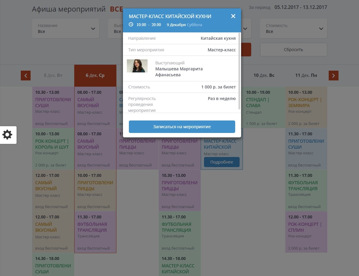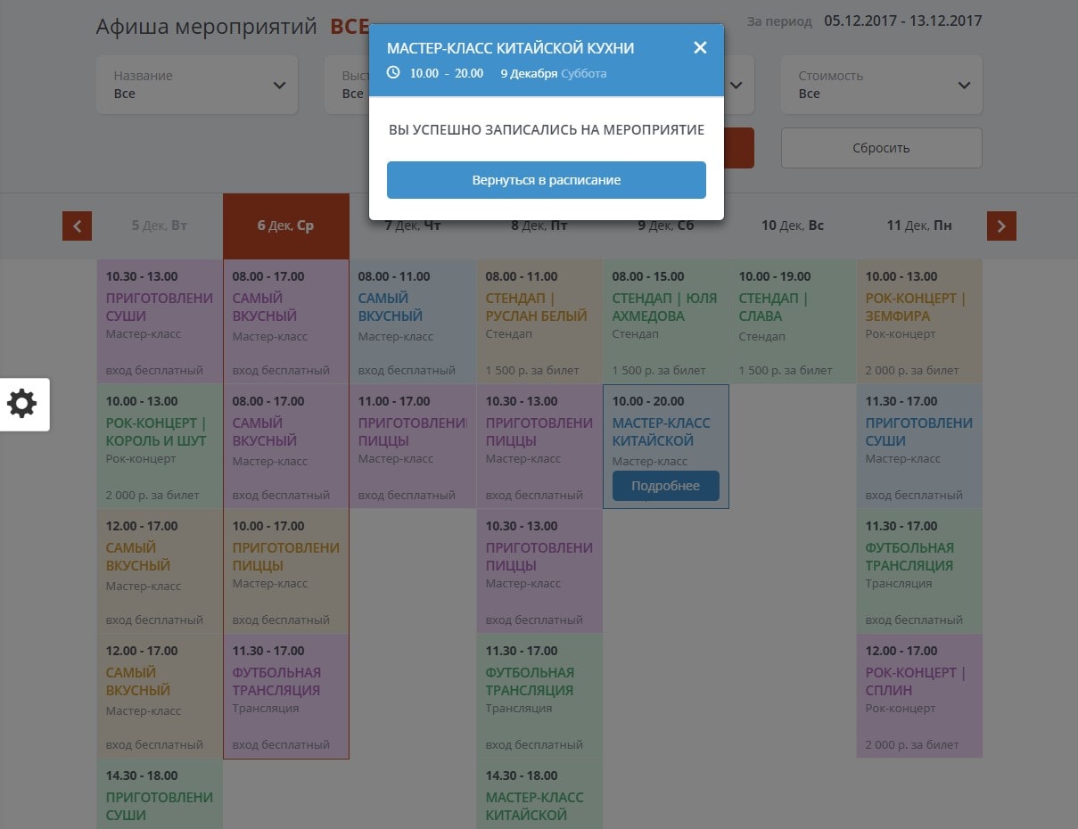 - Модуль расписания (афиша), позволяющий создать полноценное расписание с возможностью записи на различные проводимые мероприятия, а также забронировать стол.