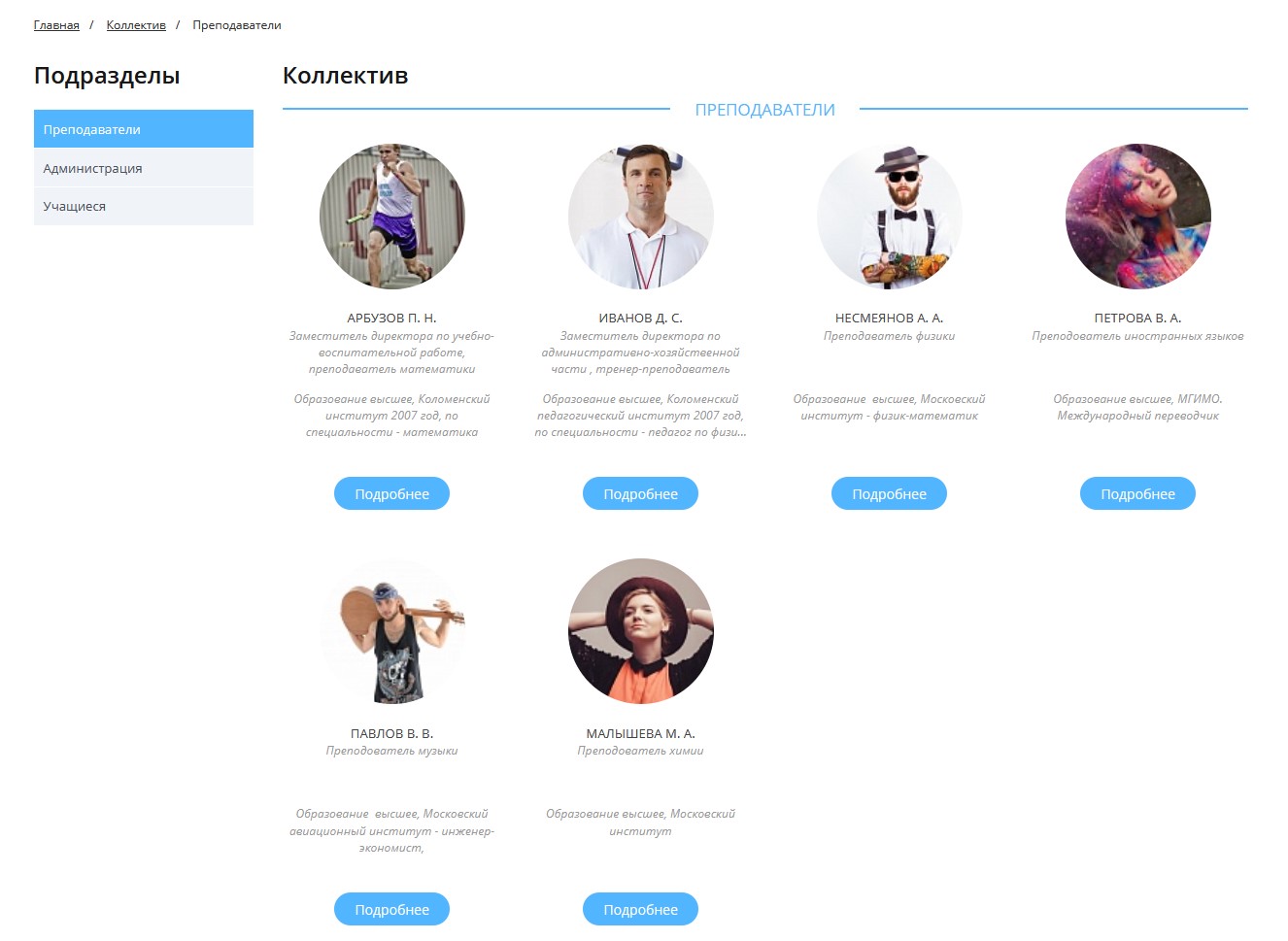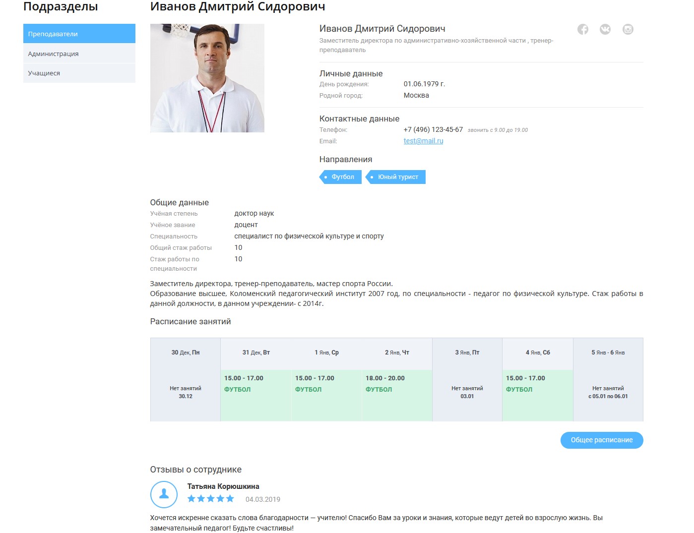 - Личная страница каждого преподавателя с его заслугами и наградами, а так же блоком занятий, которые он ведет.
