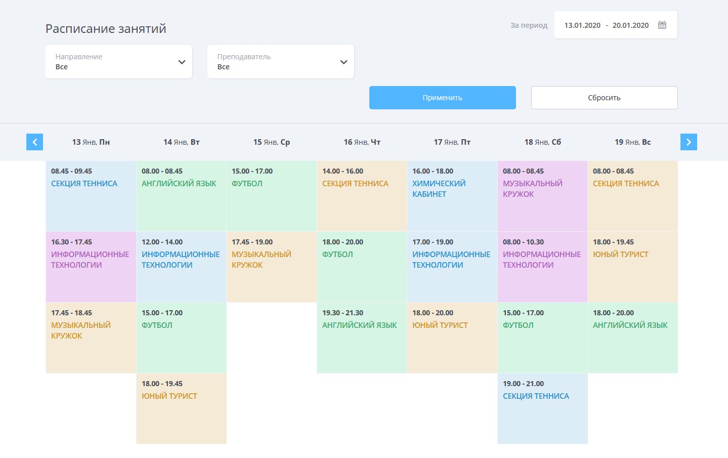 - Модуль расписания, позволяющий создать полноценное расписание занятий с фильтрами (например, по направлениям дополнительного образования, преподавателям).