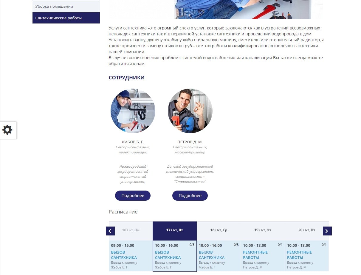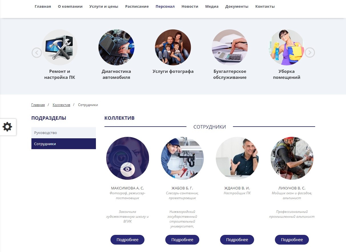 - Для каждого направления деятельности предусмотрен собственный раздел со списком сотрудников и расписанием.