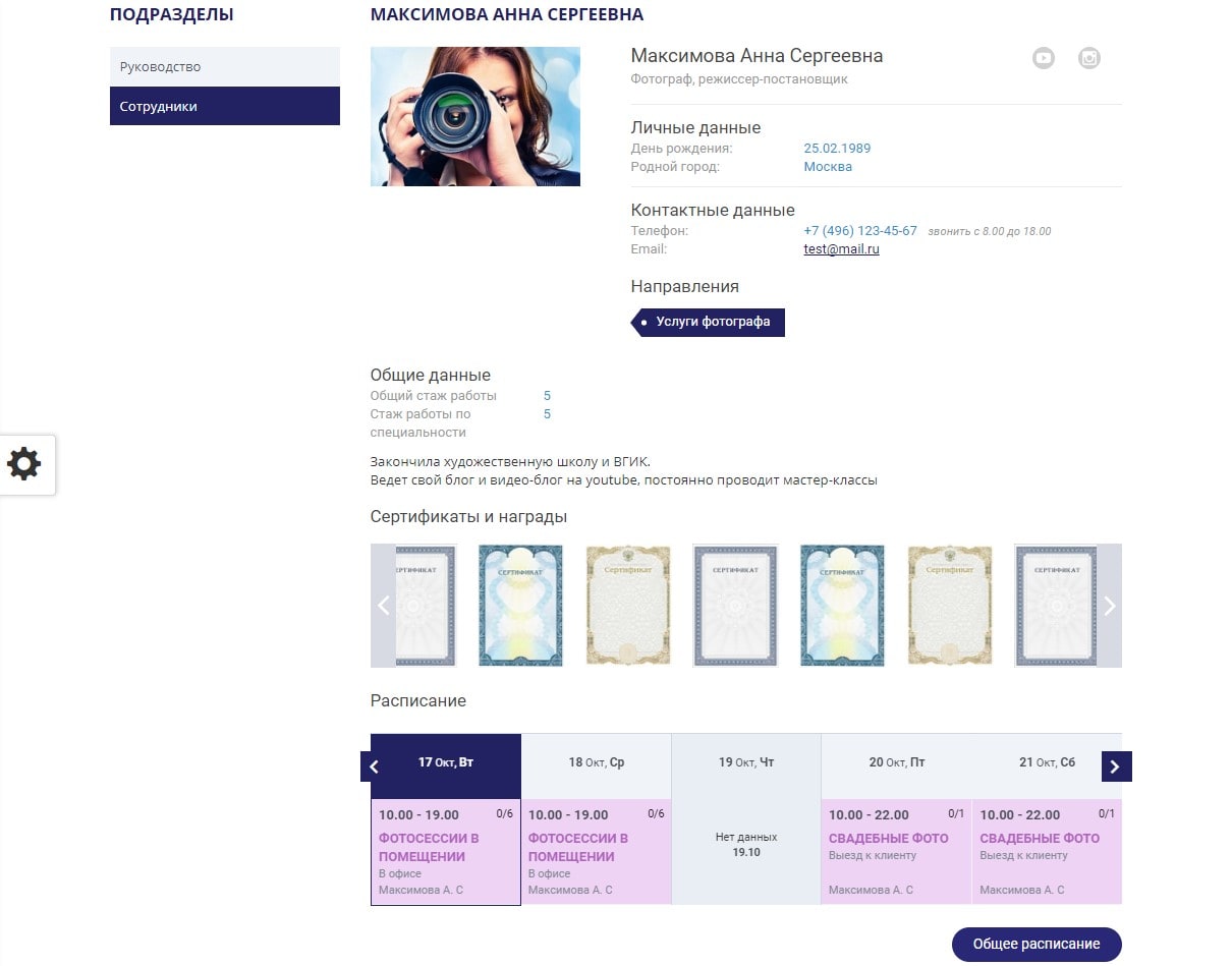 - Личная страница каждого сотрудника с подробной информацией, с его заслугами и наградами, а также блоком личного расписания с возможностью записи.