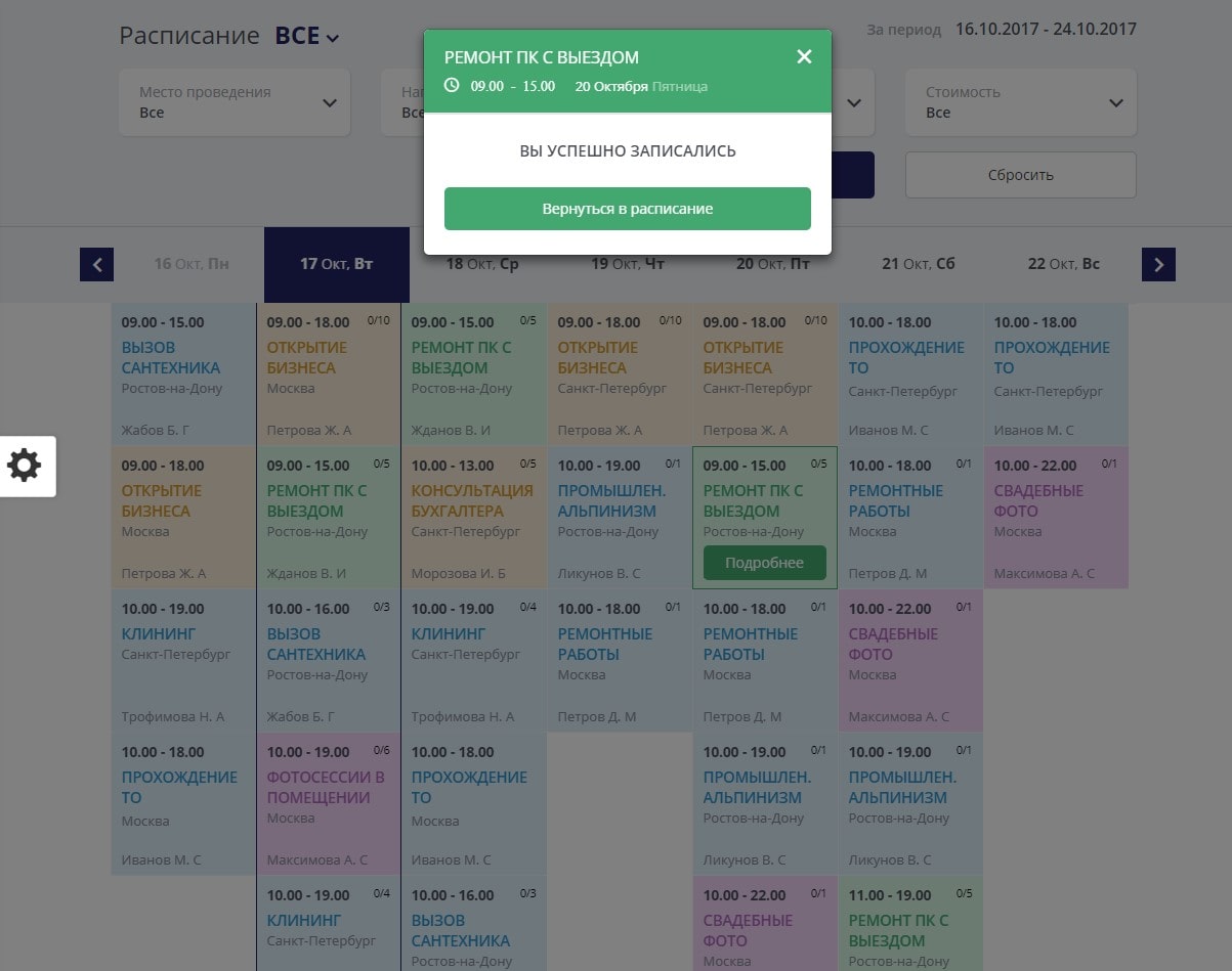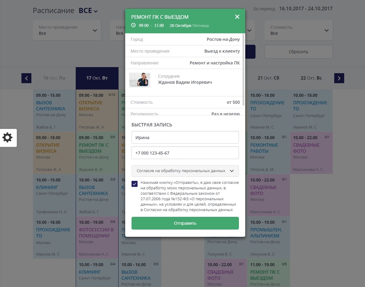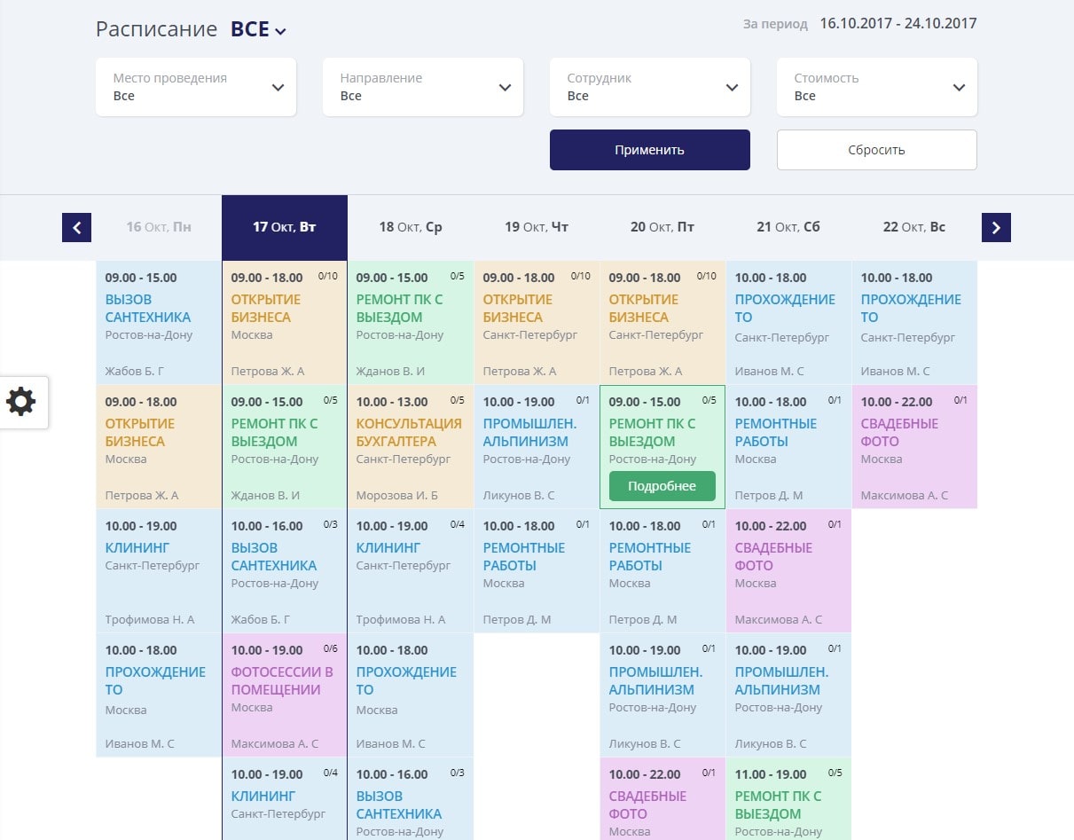 - Гибкий модуль расписания позволяющий создать полноценное расписание с возможностью записи, как по дням, так и по часам в течение дня.