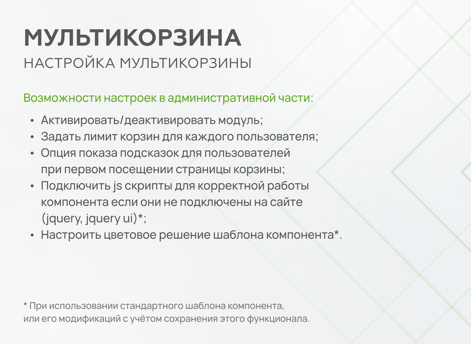 Модуль предоставляет возможность работы с несколькими корзинами в интернет-магазине.