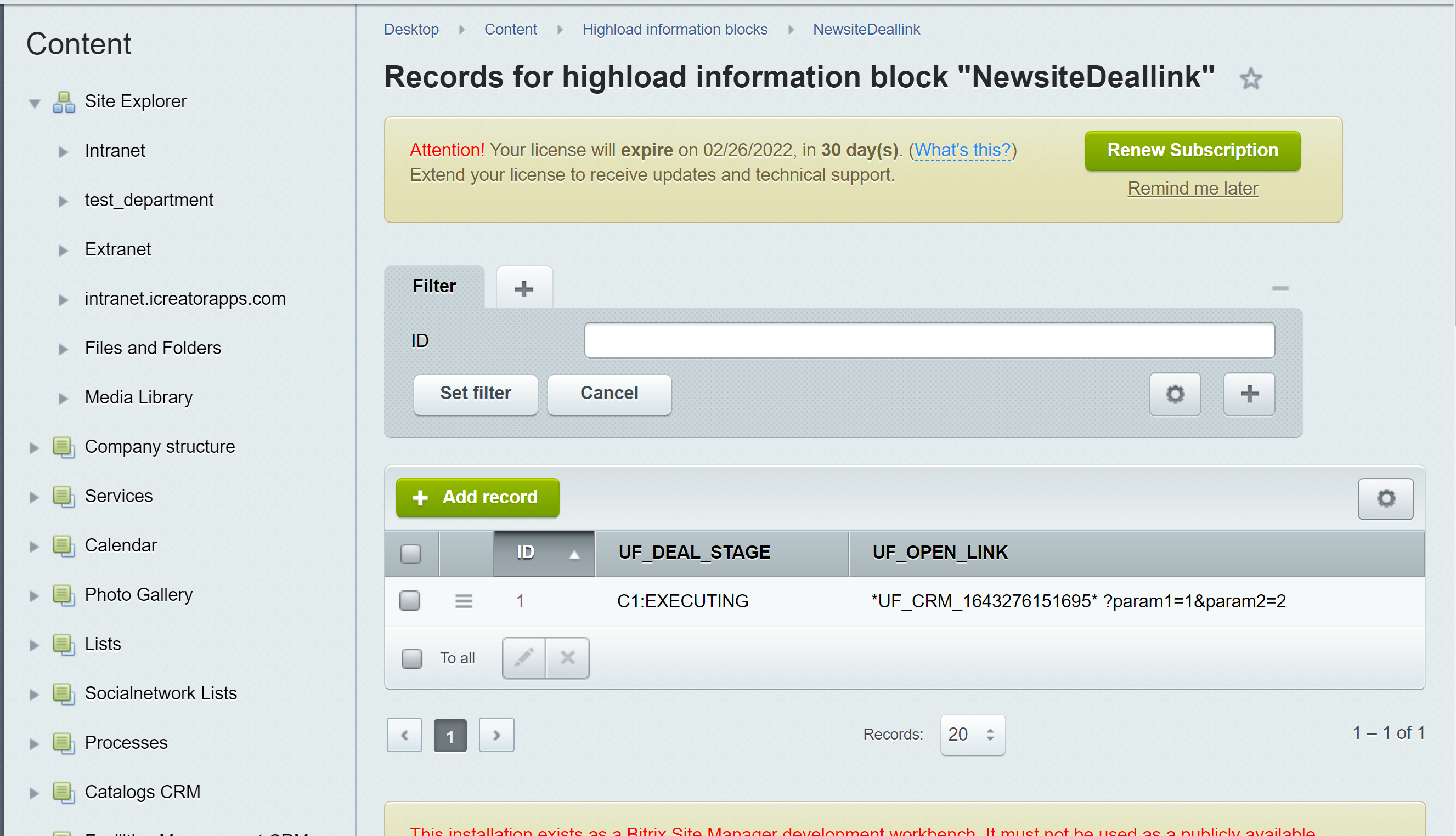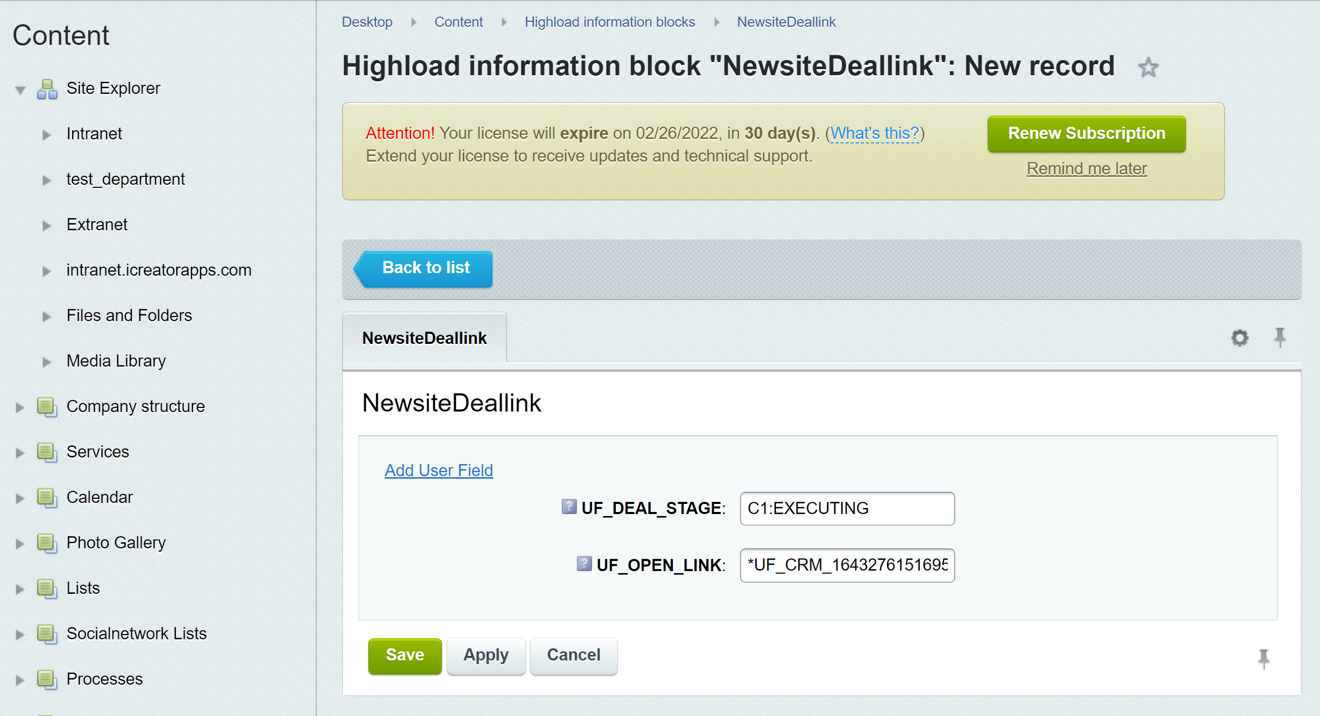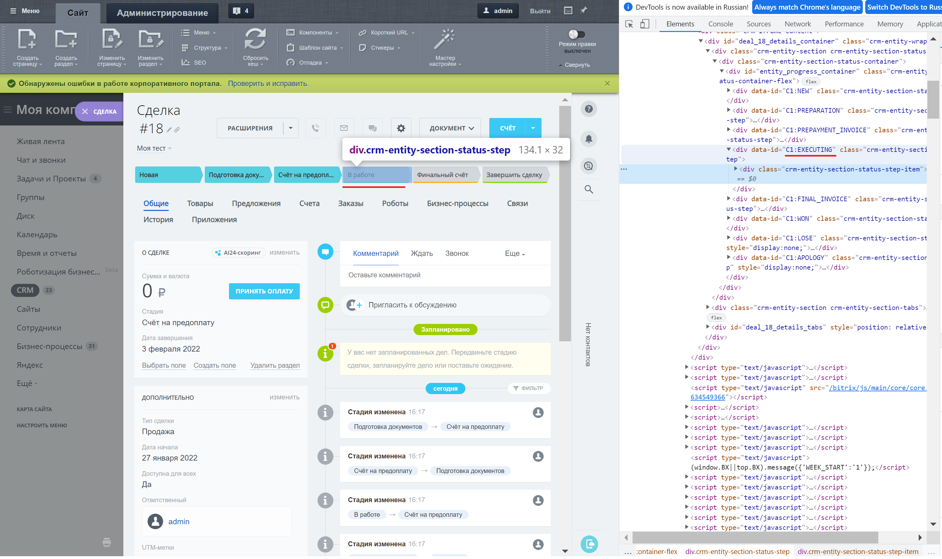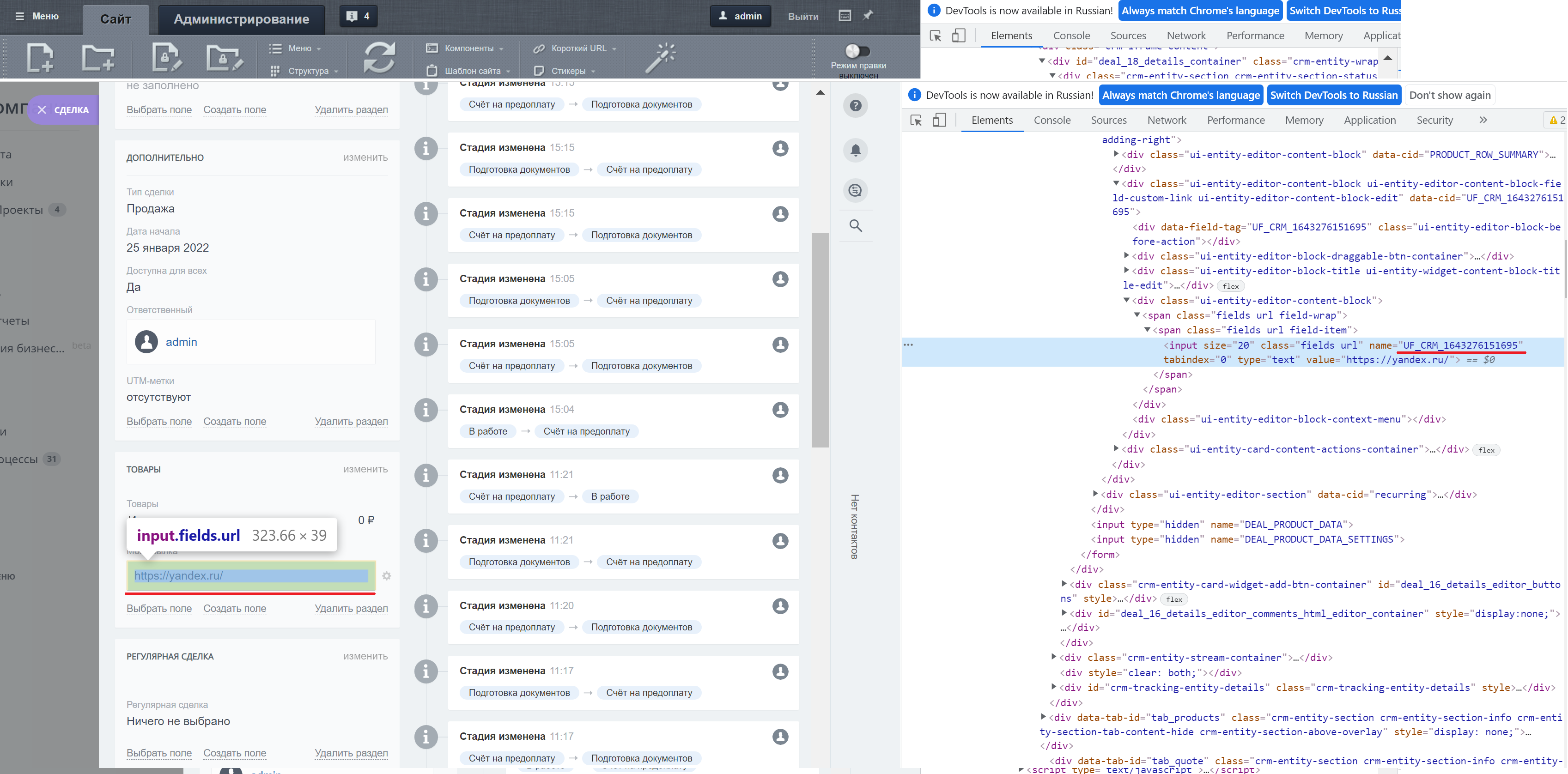 Модуль позволяет выбрать тип сделки и статус, при присвоении которого будет открыта новая вкладка с указанной ссылкой