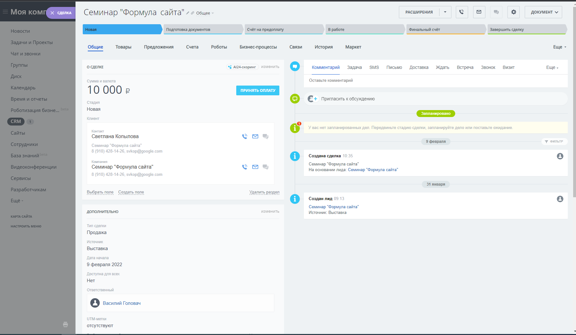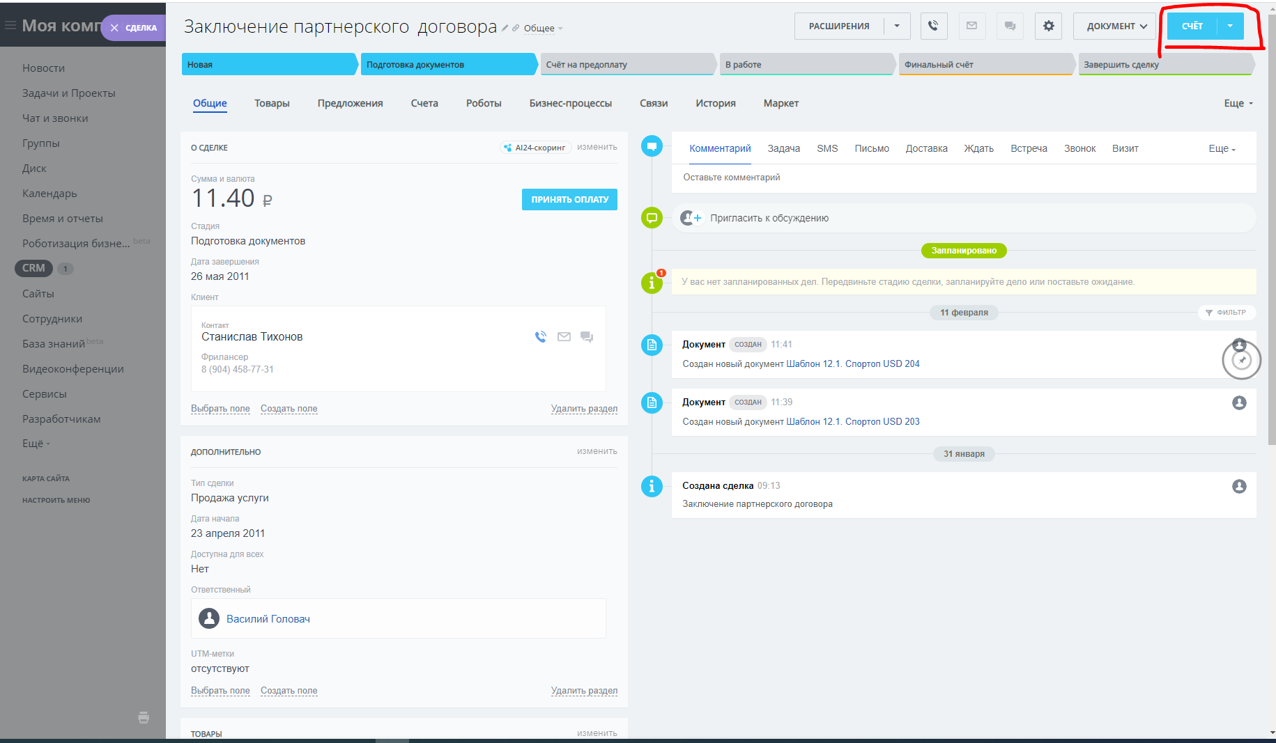 Данный модуль скрывает кнопку "Счёт" в карточке сделки. После установки модуля кнопка "Счёт" в карточке сделки будет скрыта.