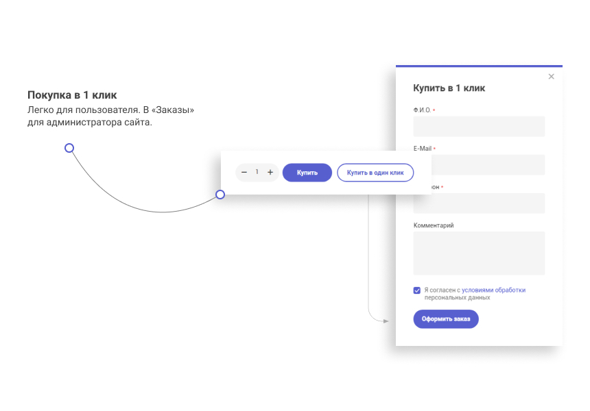 - покупку в один клик, в том числе из корзины (функция адаптирована к работе с торговыми предложениями);